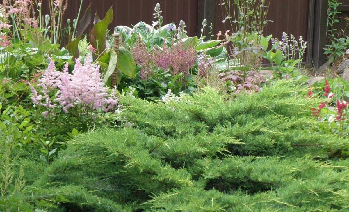 В свою очередь, можжевельник также прекрасно может соседствовать с астильбой. Он выглядит изысканно, ярко, благодаря чему часто является главным в композиции. Несмотря на то, что астильба в данном случае будет на втором плане, смотрится она не менее привлекательно. Для декорирования ландшафтного дизайна ее достаточно часто высаживают вместе с папоротником, лилейниками или геранью. Интересным и нетипичным будет сочетание в саду астильбы с ландышами, тюльпанами, рододендронами и крокусами.