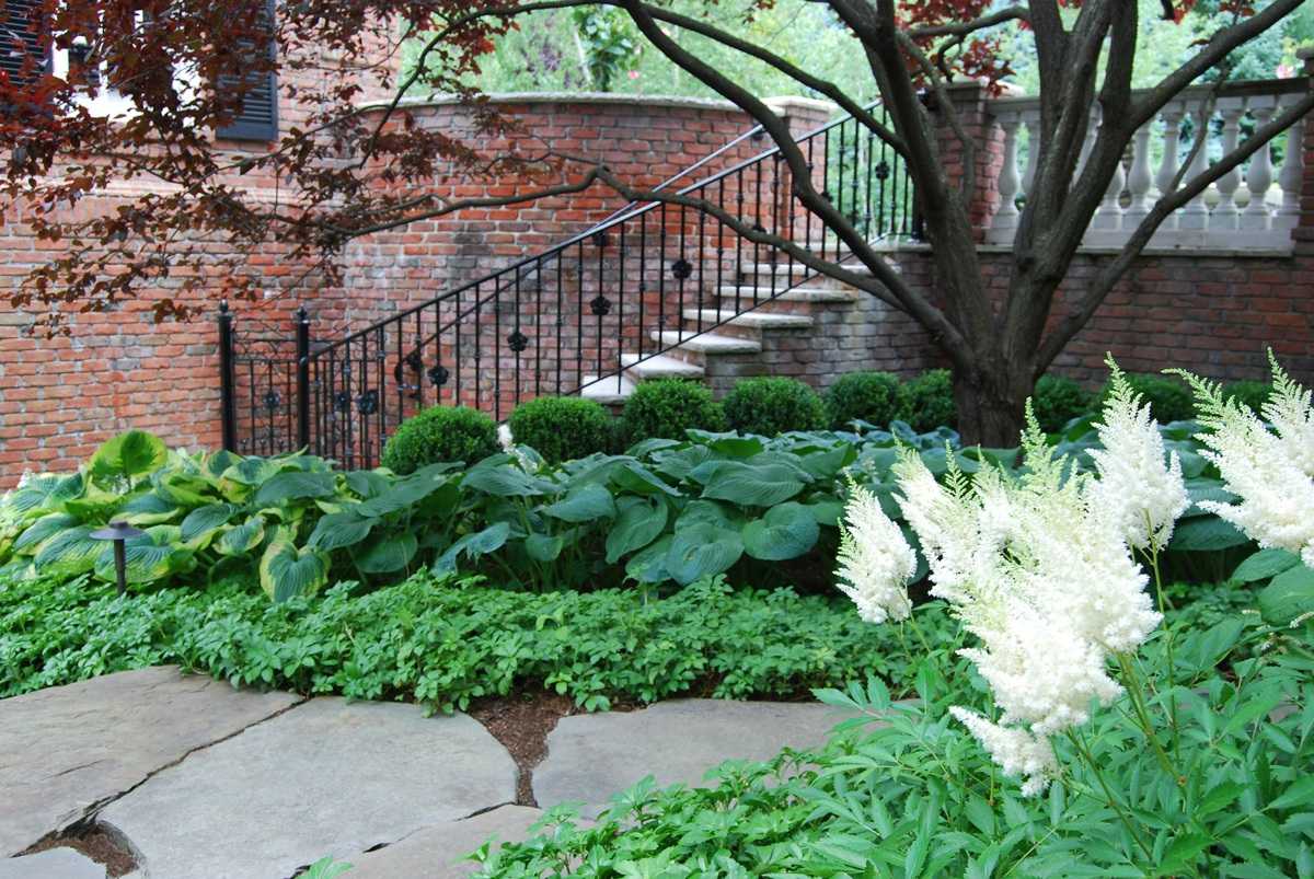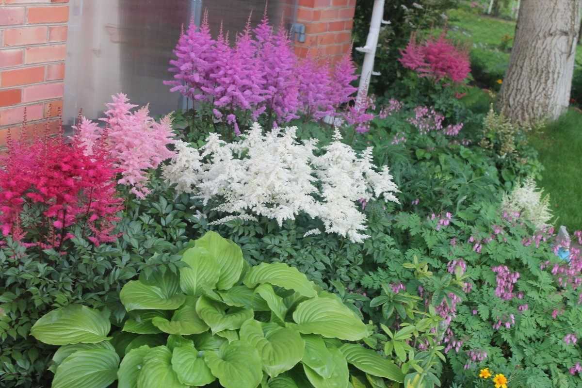 Если проект ландшафтного дизайна предусматривает разбивку миксбордера, без астильбы не обойтись. Цветок отлично сочетается с такими тенелюбивыми растениями как:
