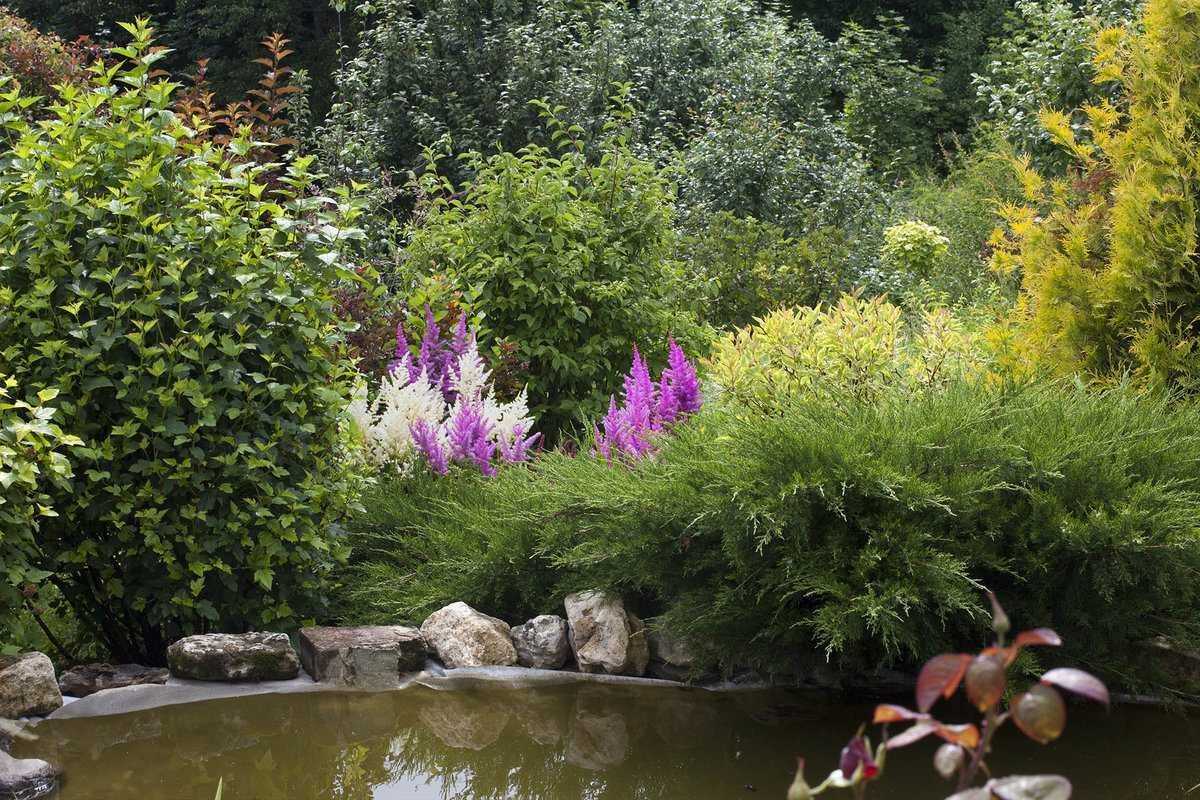 Декоративные хвойные, окруженные одновидовыми вкраплениями многолетника – простая и элегантная композиция, с которой справятся даже новички. Также сложно переоценить роль растения в оформлении водоема. Астильба – коренная обитательница прибрежных речных зон. Растение и вода – неделимы.
