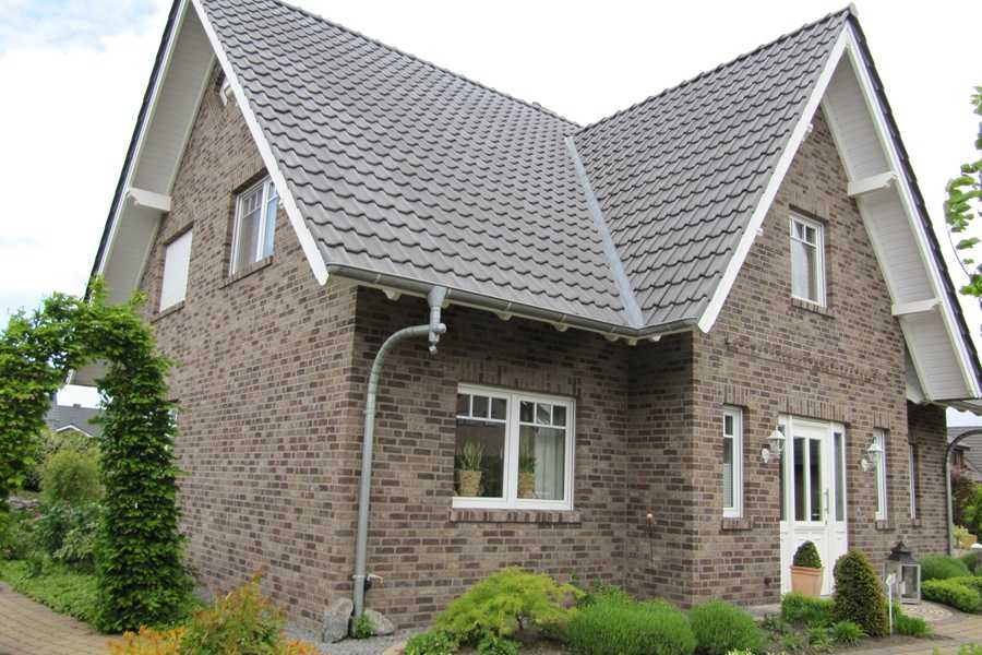 Если посмотреть фото домов из кирпича в европейском стиле, в глаза бросается цоколь, отделанный плиткой или камнем, двух или четырехскатная крыша. Традиционный кровельный материал — натуральная черепица, в последние годы активно вытесняемая металлочерепицей. Окна обычно небольшие, прямоугольной формы, иногда со скругленным верхом. Двери и оконные рамы выполняются в контрастном к цвету стен тоне.