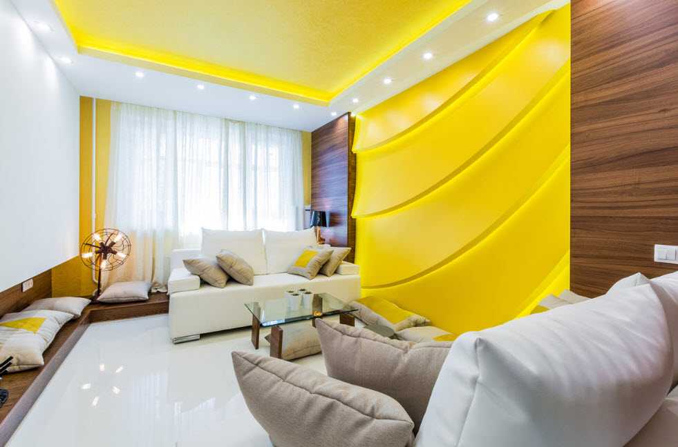 - Смешивание желтого и цвета слоновой кости. Яркий вариант, подойдёт для гостиных, нуждающихся в дополнительных источниках света. Вносит радостные нотки.