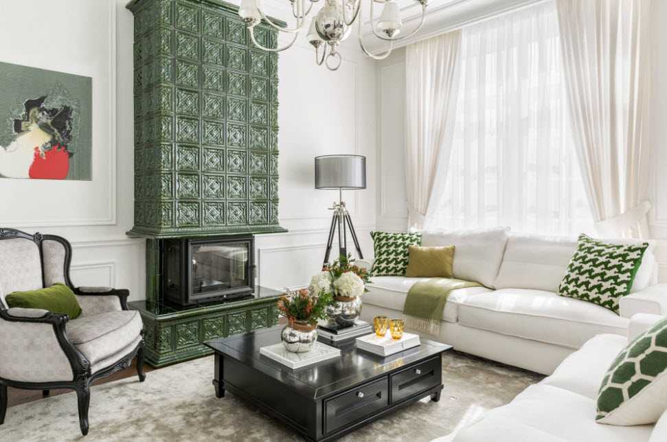 В классических гостиных белый разбавляют другими оттенками. Красиво смотрится сочетание с коричневым, зеленым, вишневым, серым, синим.