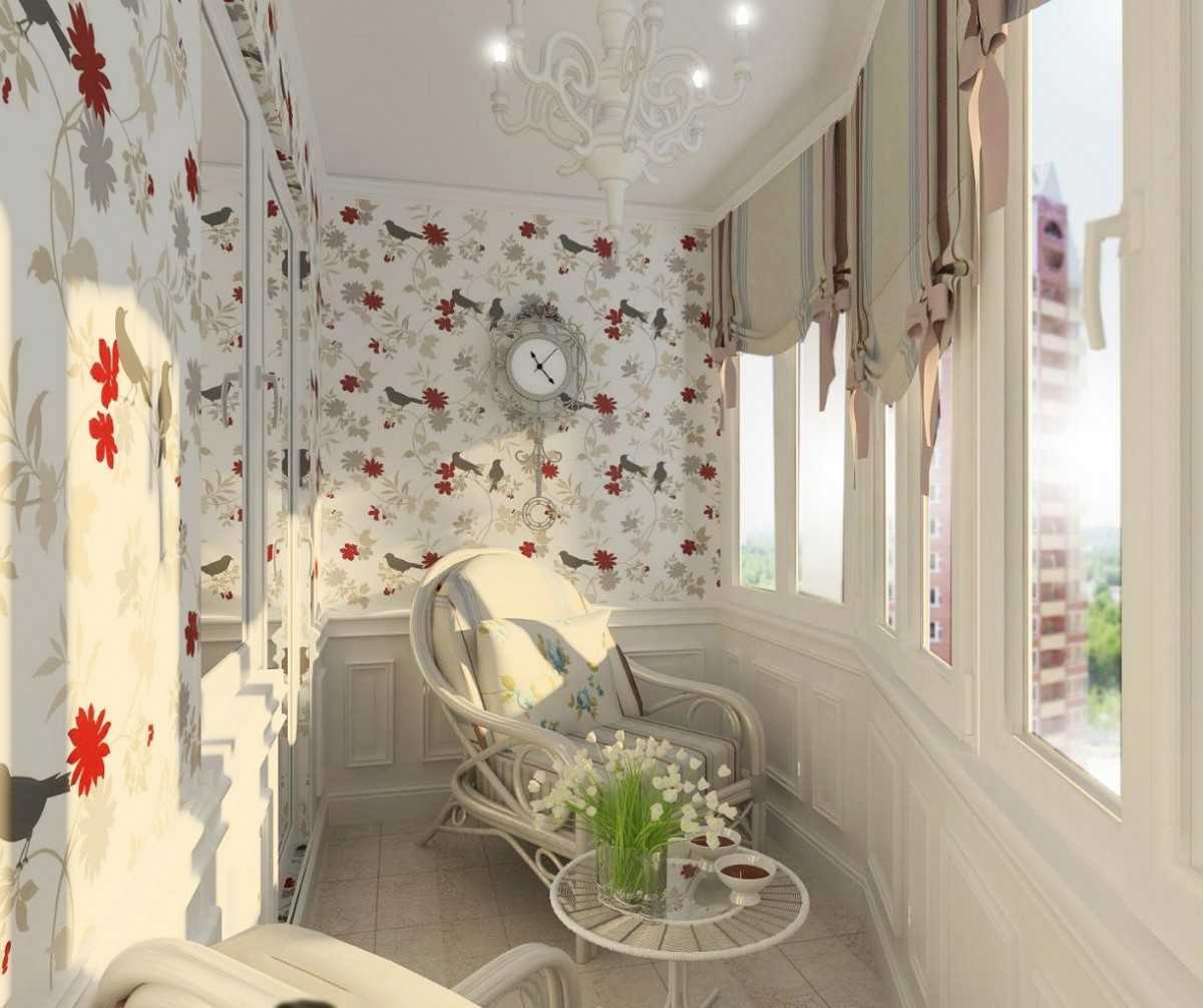 Лучше всего для этой обстановки подойдет садовая, плетеная мебель. Она должна небольшие размеры, поэтому часто на таких лоджиях можно увидеть откидные стулья и стол.