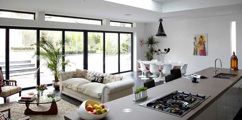 Распространенный прием – расположение дивана в центре комнаты, лицом в гостиную и спинкой к кухне.