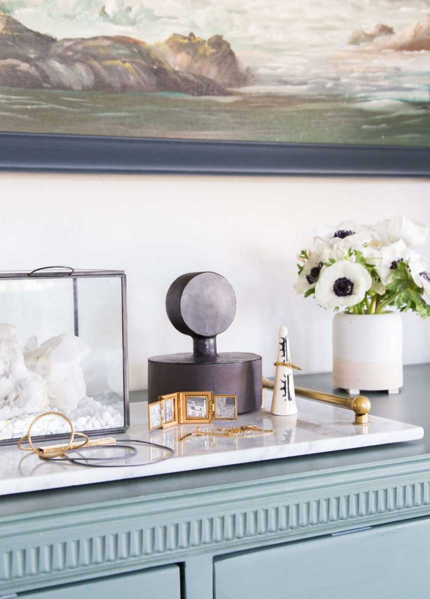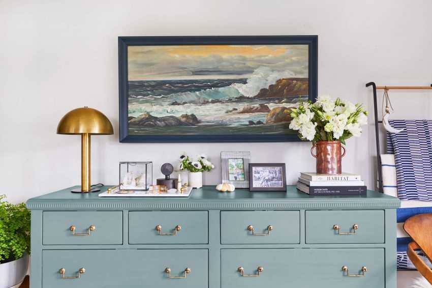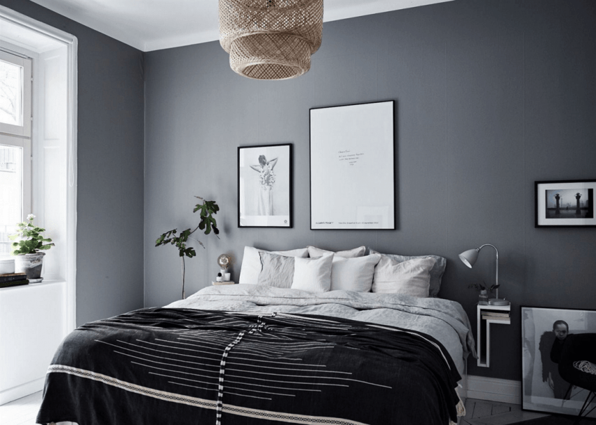 Разбавить холодный интерьер с серыми стенами помогут картины, фоторамки и иные элементы декора