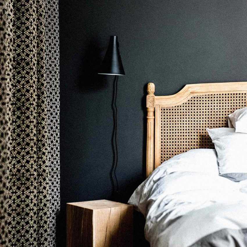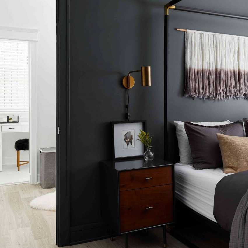 Чтобы комната не смотрелась перегруженной, необходимо разбавить спальню светлыми шторами либо остальной мебелью.