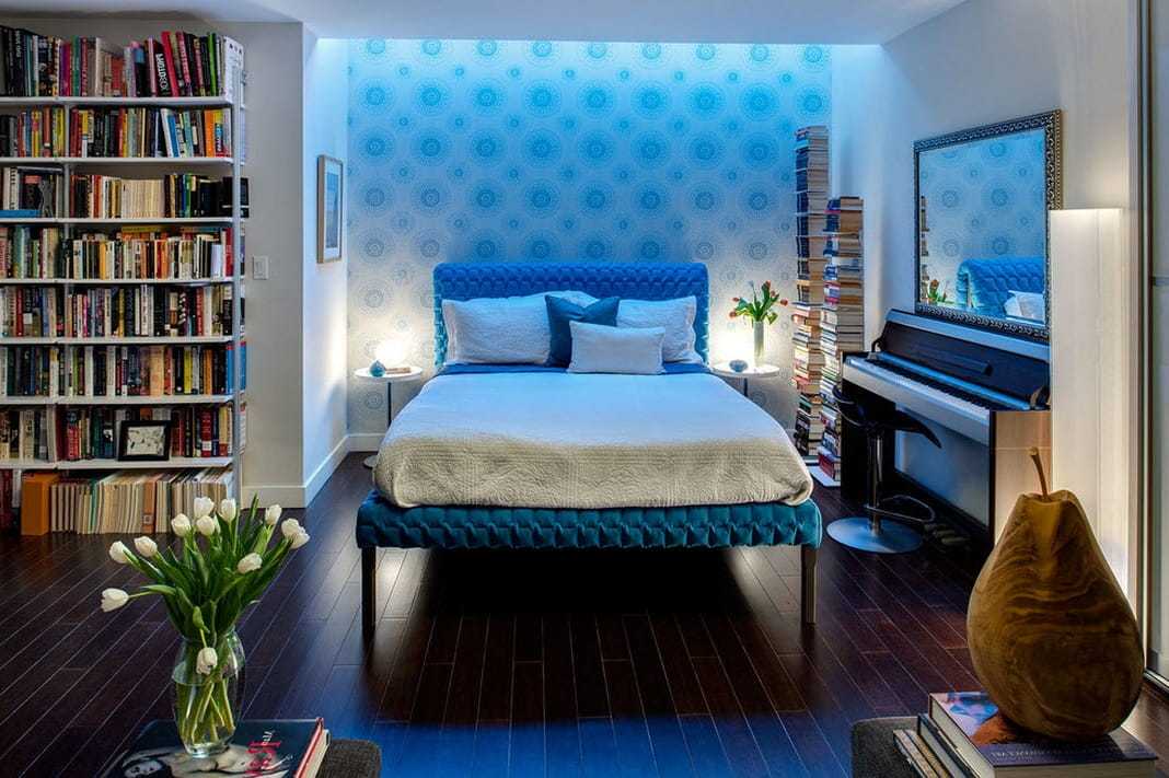 - В спальне, оформленной в современном стиле, будет править минимализм: простое покрывало, кровать без лишних украшений и безделушек в удивительных цветах: красном, темно-синем, синем или желтом.