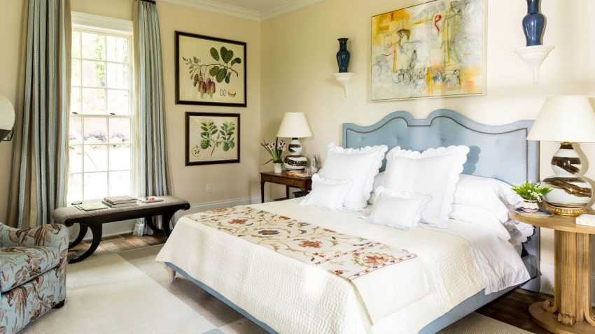В бежевой спальне отлично будут смотреться элементы, добавляющие интерьеру изысканности. Вышеупомянутый белый воздушный балдахин, постельное белье с розовыми розами, кремовая штора, мягкие подушки на кровати и тканевые абажуры — лишь некоторые из аксессуаров, которые создадут здесь нужное настроение.