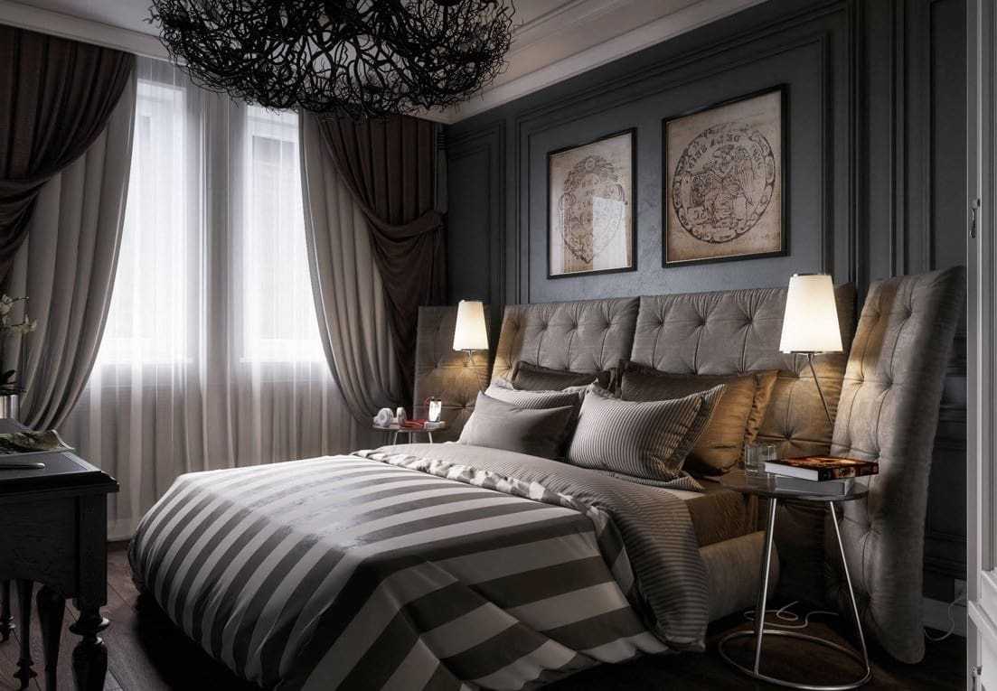Роскошная спальня в темных тонах создает атмосферу размеренного спокойствия