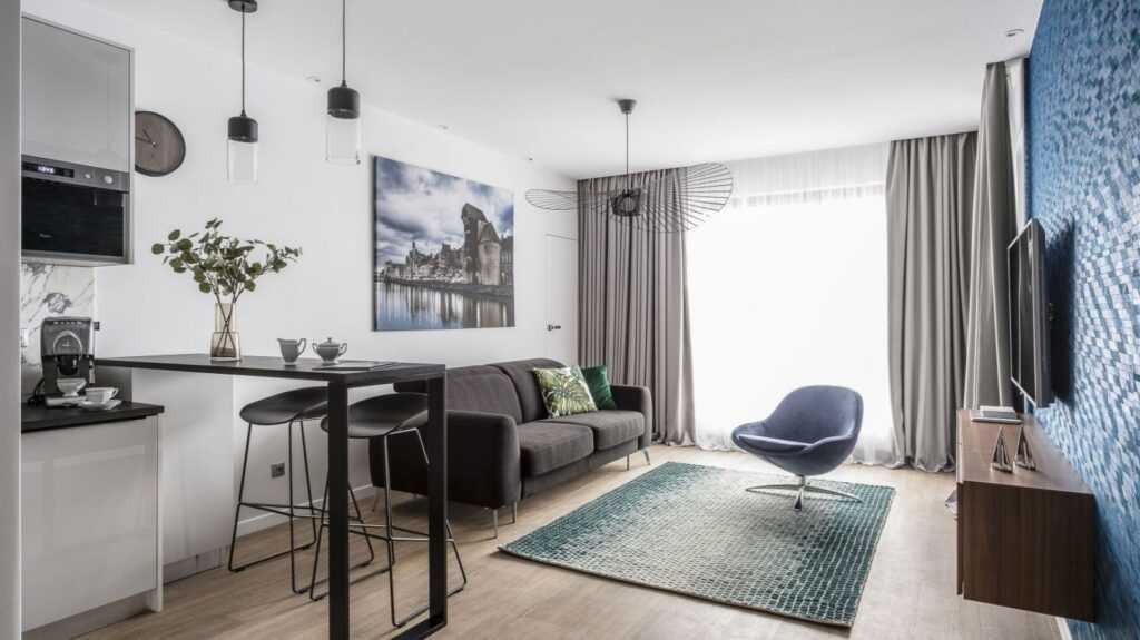 - В современном стиле — картины в черных рамах, серая обивка мебели, широкоформатные постеры, лампы с геометрическими фигурами.