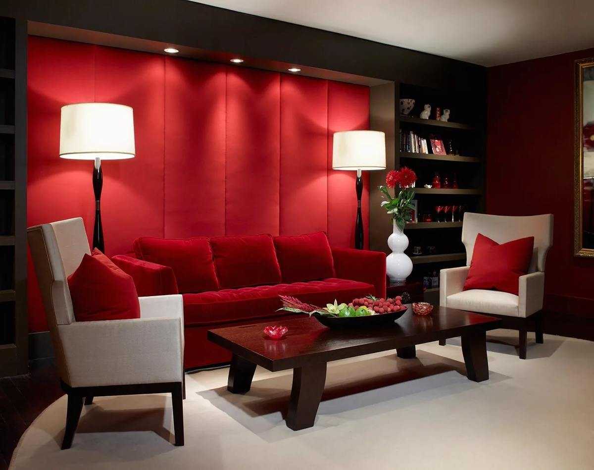 Но современный зал с использованием столь эмоционального и глубокого цвета может быть разным.