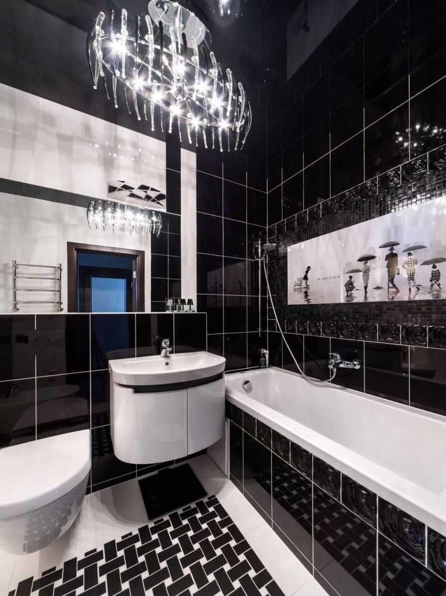 - гламур с комбинацией черных блестящих плиток с белыми красочными дополнениями и геометрическими узорами;