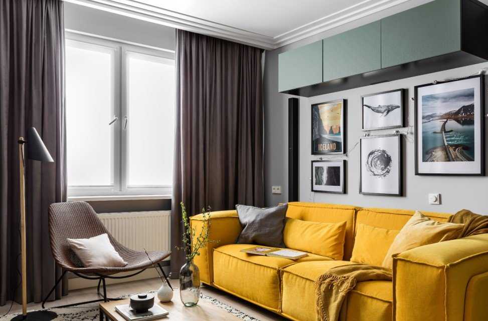 Использование в интерьере мебели этого тёплого оттенка смотрится весьма оригинально и позволяет дополнить комнату нотками аристократизма. Если же подобная идея кажется слишком выразительной, всегда можно приглушить яркость горчичного оттенка при помощи шоколадных, белых либо серых тонов.