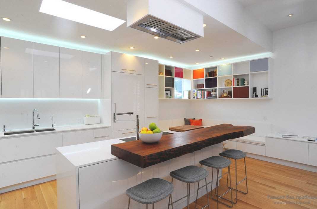 Белое дерево в интерьере создает простор и ощущение чистоты. Наиболее часто встречается в современном стиле и минимализме. Белый пол подчеркивает яркость стен, деревянный потолок делает комнату длиннее, белая мебель подходит для спальни, столовой, реже гостиной и кухни.