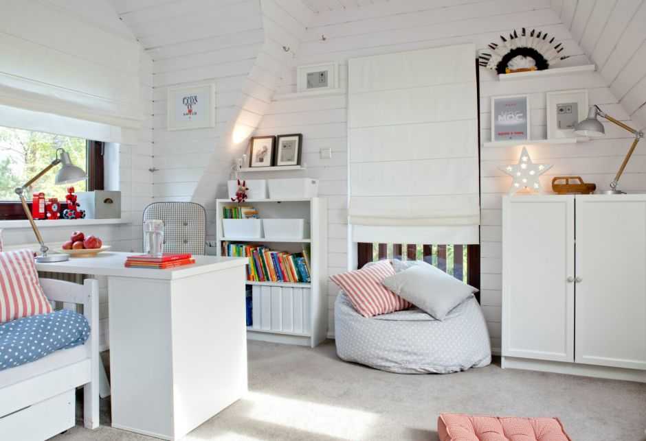 Скошенные потолки на мансарде делают помещение более таинственным и необычным. Однако здесь могут возникнуть определенные сложности с выбором кроватки, например, двухуровневую или кровать-чердак можно использовать только при достаточной высоте потолков.