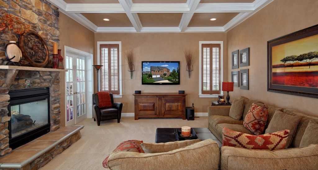 Вместо камина можно расположить телевизор, поставив его на небольшой столик или повесив на стену. Если телевизор расположен на столике, то над ним останется достаточно места для фотографий или небольших полочек, на которых можно поставить сувениры, фото и другие приятные мелочи.