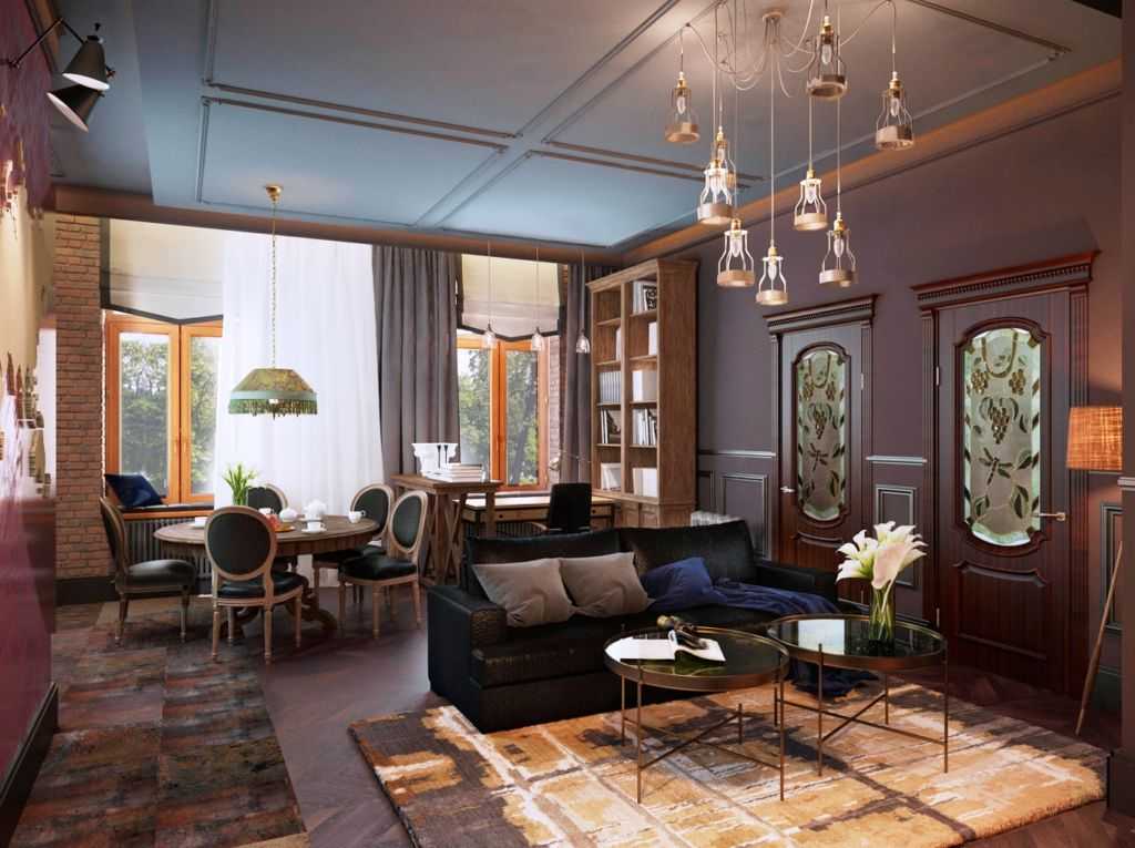 Гостей может удивить смешение старой и новой мебели: старинный комод и шкаф-купе, современный книжный шкаф и этажерка от бабушки. Неплохо будут сочетаться ампирные кресла со стеклянным столиком.