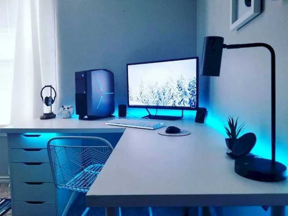 Этот простой дизайн рабочего пространства выглядит как обыкновенная рабочая зона. Минималистичная скандинавская стилистика очень популярна в последние годы. Мы видим здесь минимум декора, а цветовая палитра нейтральная — белый, серый и черный. Только холодное синее светодиодное освещение выдает игровой аспект комнаты.