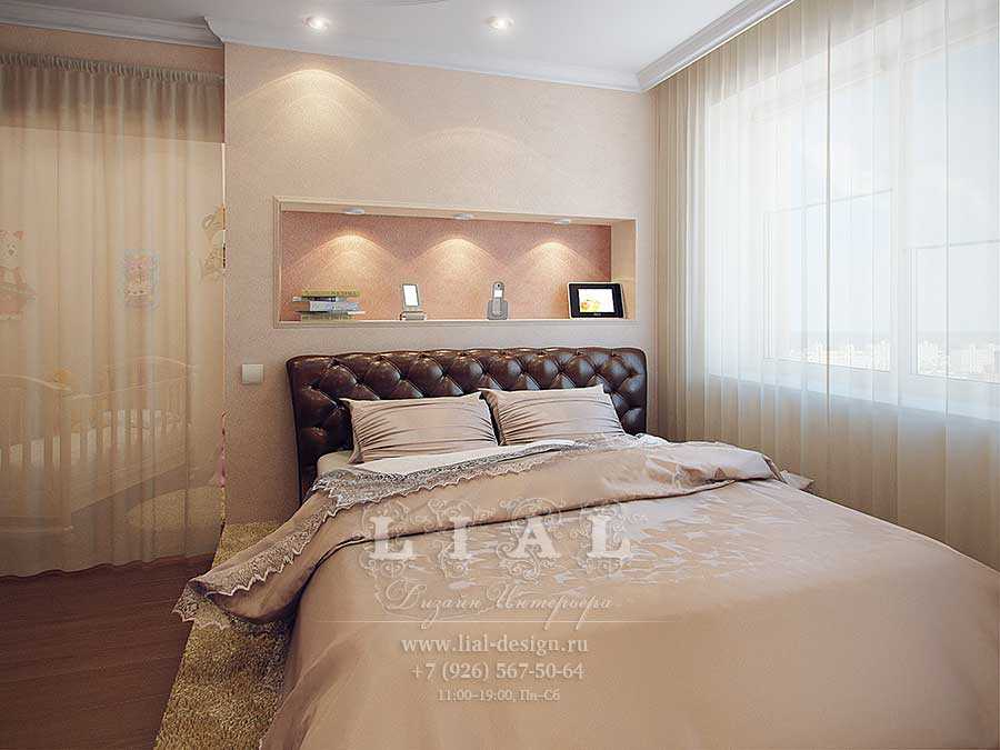 В семье с новорожденным дизайнеры нередко сталкиваются с задачей разместить в спальне для взрослых еще и детскую кроватку. Для колыбели лучше всего выбирать часть комнаты, недоступную для сквозняков и яркого света. Это обеспечит малышу полноценный и спокойный отдых. Оградить кроватку для малыша можно с помощью полупрозрачной занавески, как на фото выше.