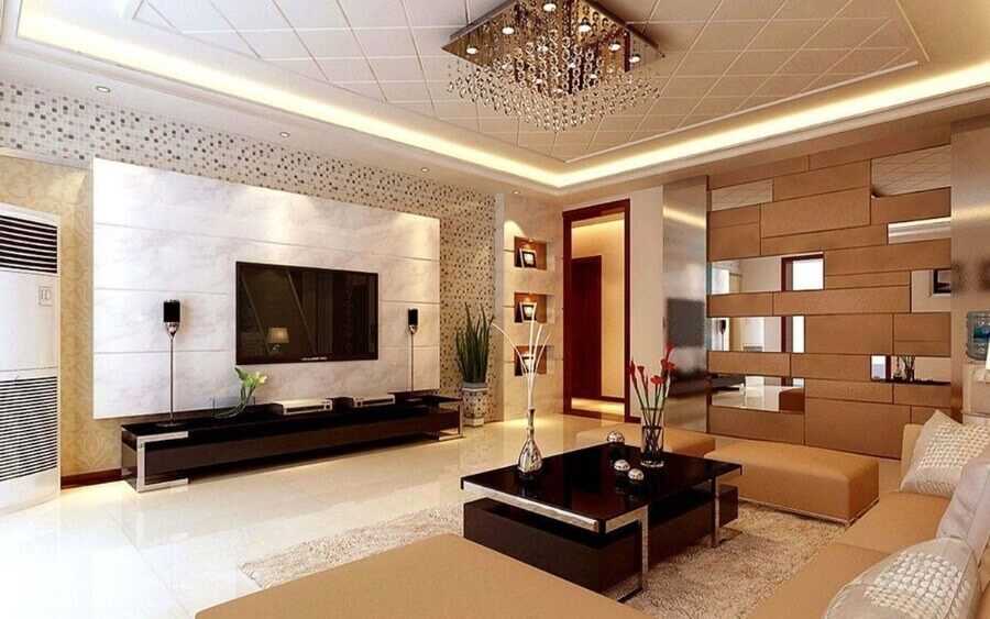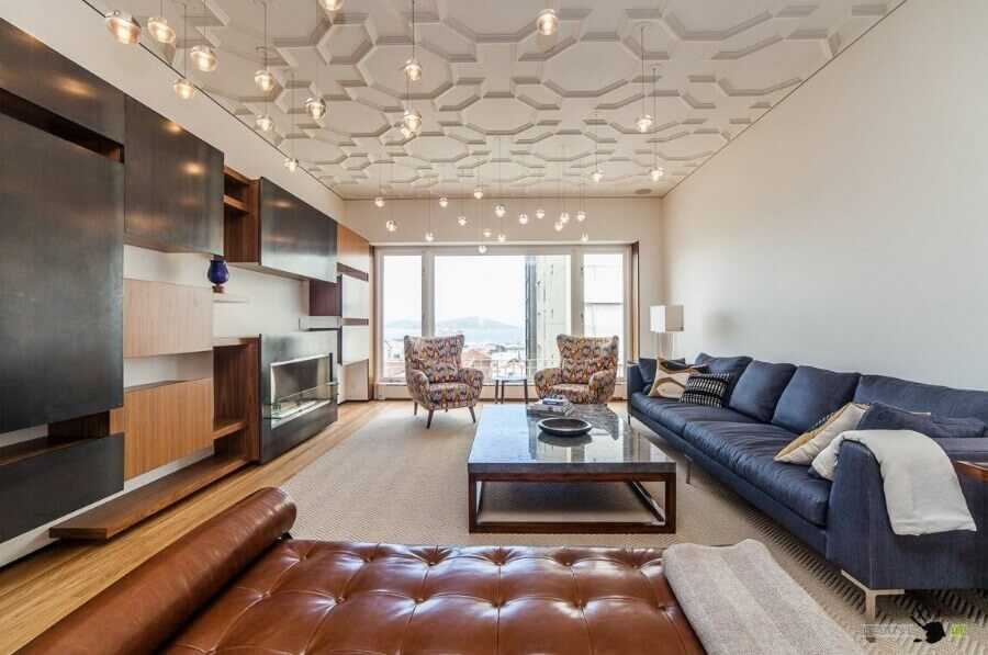 Что же касается материалов для потолка в гостиной, то смело выбирайте любой понравившийся вам вариант. Это могут быть и многоуровневые конструкции, и зеркальные потолки, и фотообои. Если размер комнаты позволяет – попробуйте комбинировать несколько материалов для зонирования пространства.