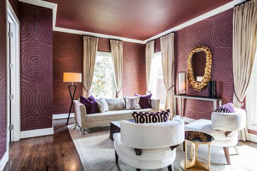 узорчатая поверхность – такой декор чаще всего встречается на тканевом полотне. Богатый орнаментальный узор с золотом используется в дизайне гостиных в стиле барокко или ампир. Легкий цветочный орнамент прекрасно подходит для прованс или кантри.