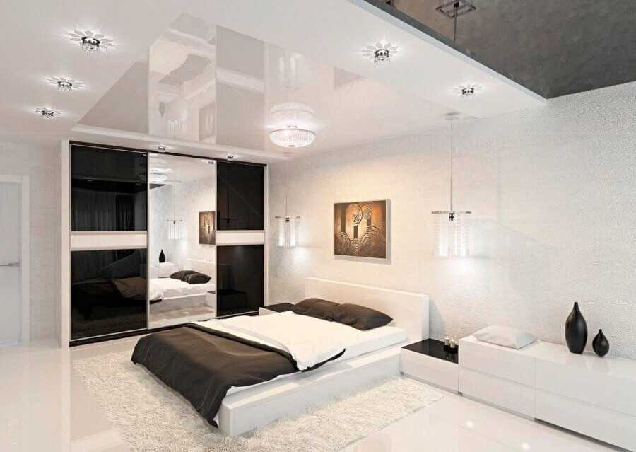 Наверное, самым востребованным является натяжной потолок из глянцевой плёнки. Такая структура имеет зеркальную поверхность, что способствует визуальному увеличению пространства из-за отражения интерьера. Очень неплохо глянцевые потолки смотрятся в сочетании с винилом другой структуры или гипсокартоном (двухуровневые потолки) (см. Дизайн натяжных потолков в спальне: советы специалистов по интерьеру).