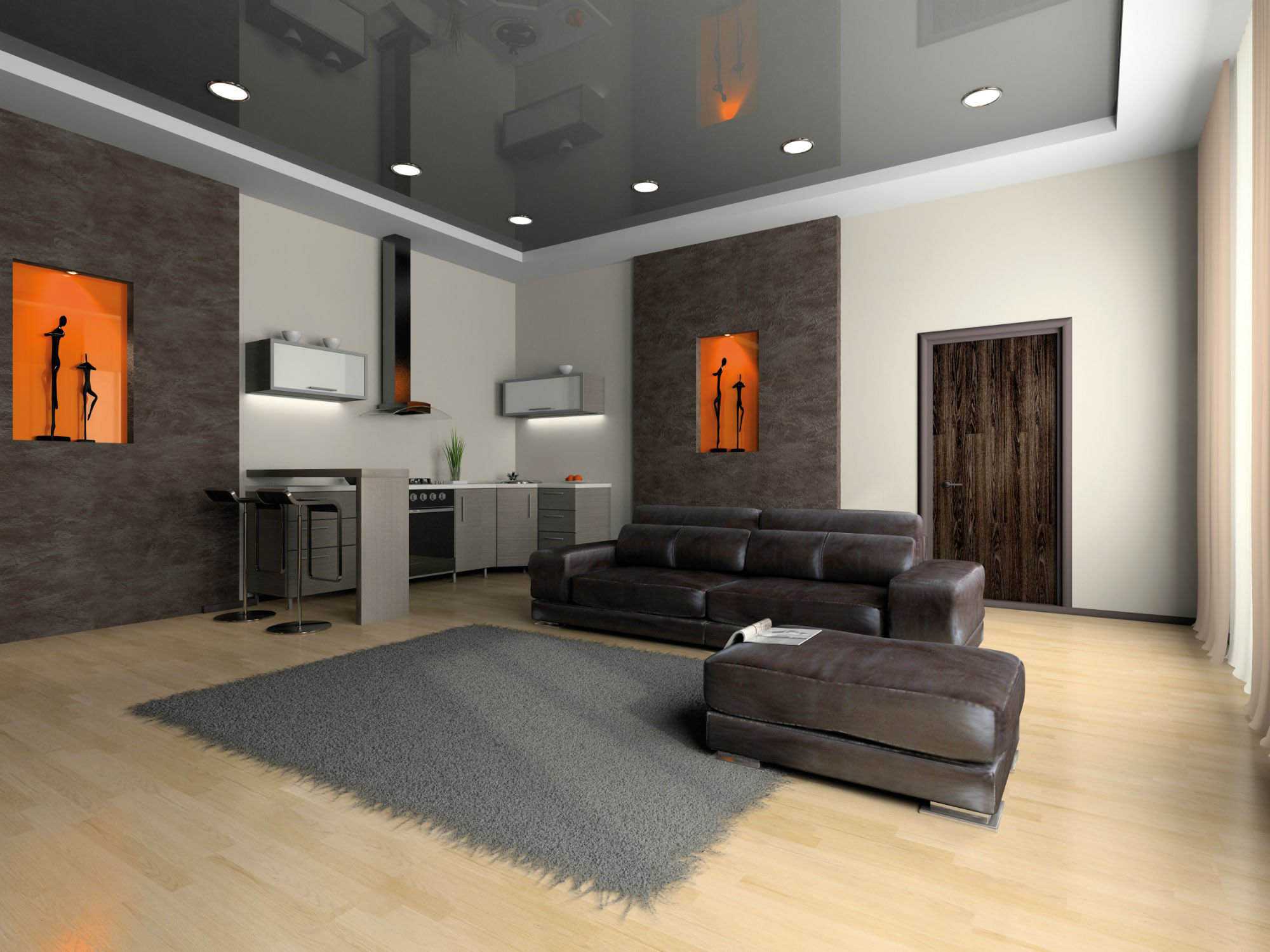 Гостиная с черными стенами и натяжным потолком станет оригинальным решением для тех, кто привык удивлять своих гостей неожиданными воплощениями