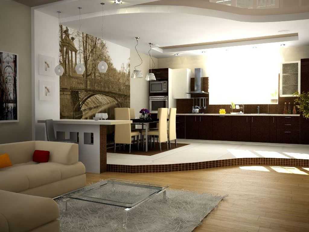 Стилей, с помощью которых можно оформить совмещенные гостиную c кухнtq немало. В магазинах есть возможность подобрать разные материалы и мебель для воплощения задуманного.