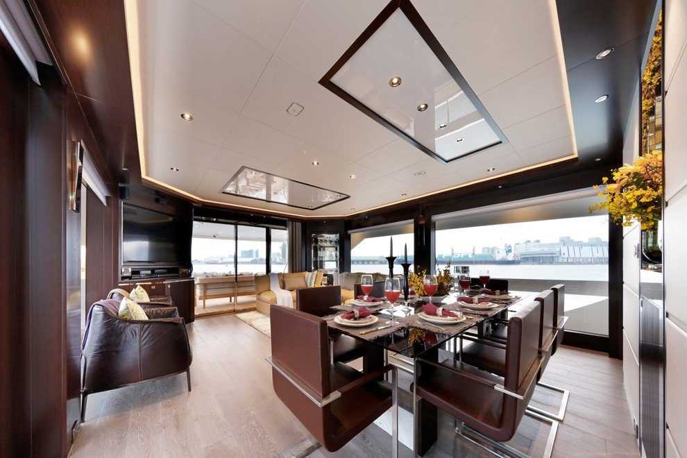 От большой гостиной до фойе, от столовой до гостевых комнат, от кабинета до ванной владельца – все помещения этой яхты отделаны эксклюзивными материалами и художественным декором, выполненным на заказ, все они дополнены произведениями искусства. Для этой яхты дизайнеры компании Molteni & C спроектировали предметы мебели и аксессуары по запросу клиента. При этом интерьеры не только отражают образ жизни владельца яхты, но и ключевые характеристики итальянского бренда.