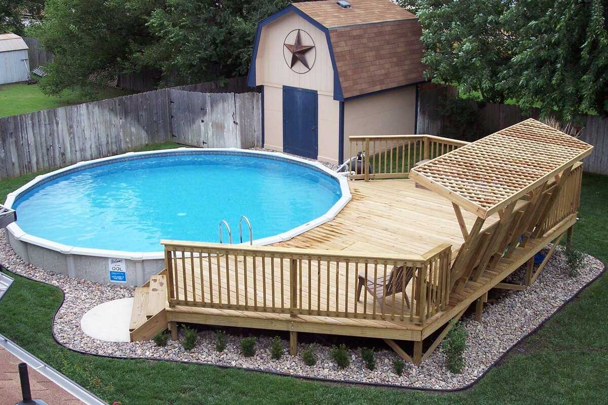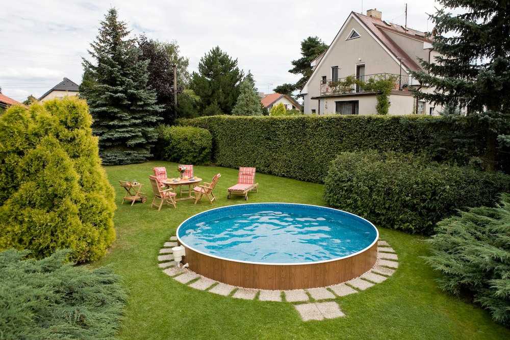 Возвышающийся над землей каркасный бассейн с небольшой площадкой рядом в окружении сада смотрится не так громоздко, как в одиночестве на открытом участке