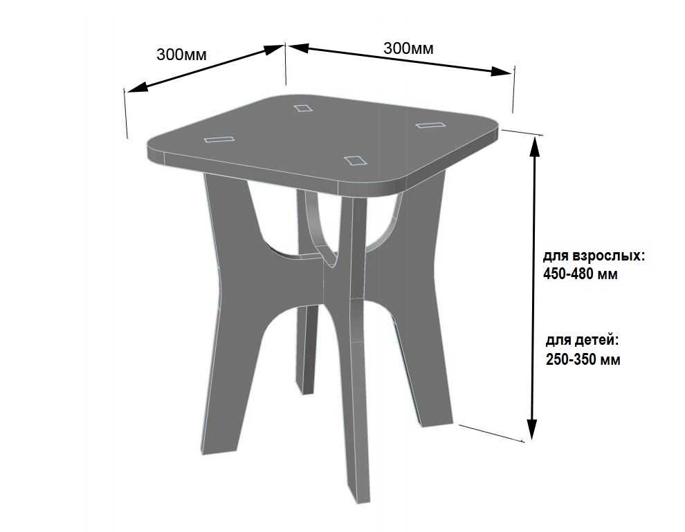 - Стандартная высота стульев из фанеры для взрослых варьируется в пределах от 42 до 48 см, для детей значение уменьшается до 25-35 см в зависимости от возраста. Главный критерий выбора — ноги должны располагаться под прямым углом и доставать до опоры.