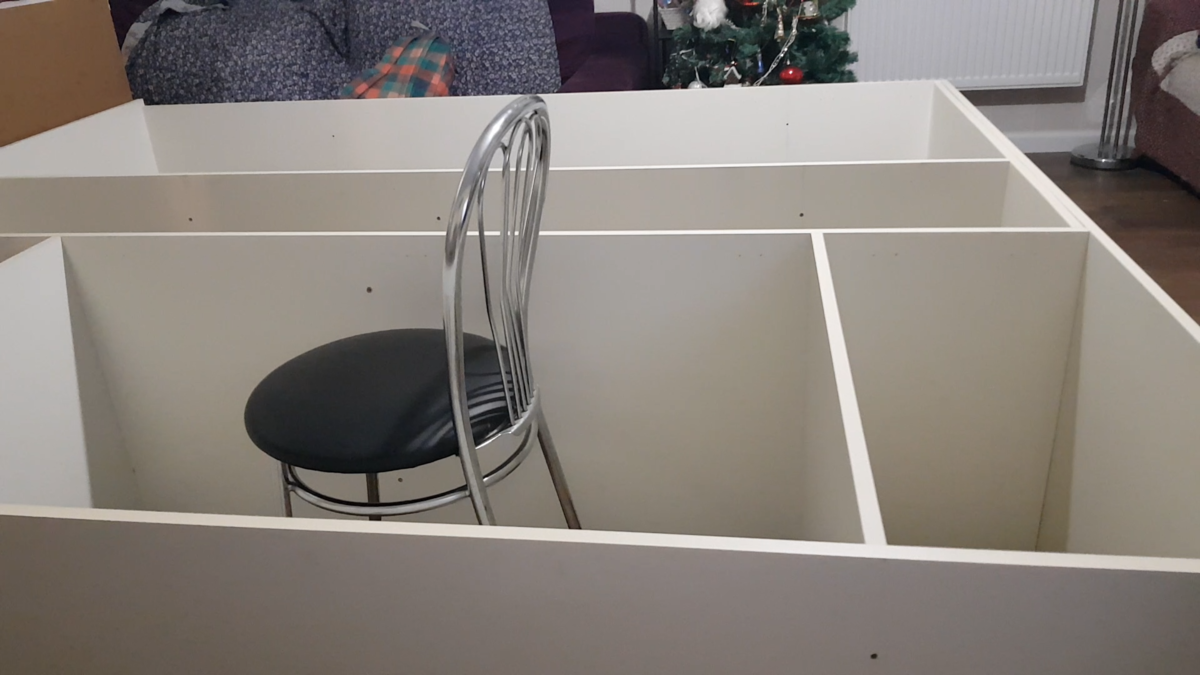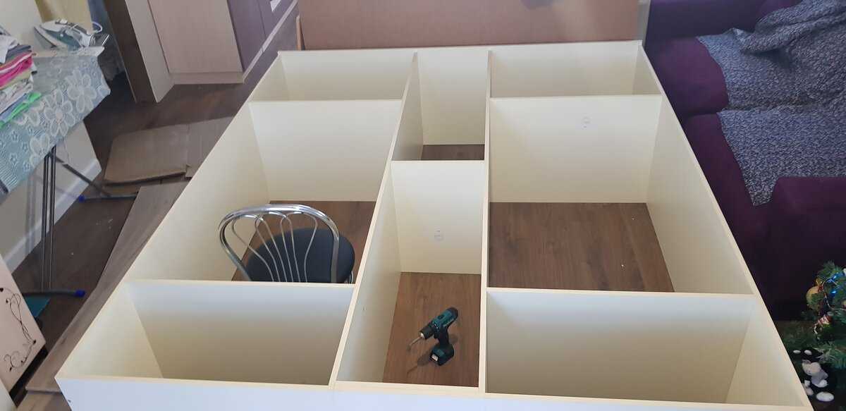 Когда большинство отверстий было готово, я их прозенковала и начала сборку с периметра, использовав мебельную стяжку, так называемые конфирматы. Оказалось, что у меня была не та бита, и поэтому она постоянно застревала, ну да ладно. И так постепенно, в хаотичном порядке я собирала шкаф, параллельно подметая это все. Потом уже добавила еще крепежа, для надежности.