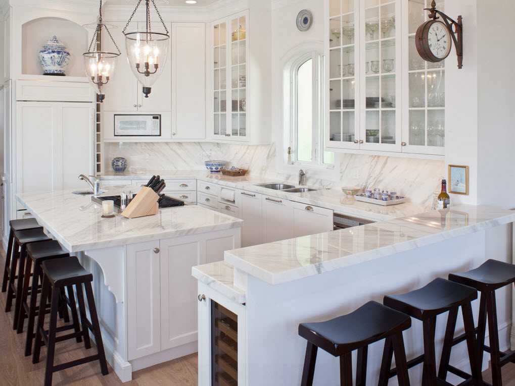 Основное правило визуального расширения пространства – светлые оттенки. Не нужно бояться белого на кухне, ухаживать за ним гораздо проще, чем за темными цветами. Для фартука и стен можно использовать палитру на 1-2 тона темнее, чем для фасадов.