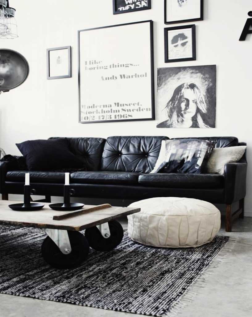 Напротив дивана часто располагается журнальный или кофейный столики на металлических или деревянных ножках. Мебель изготовлена из дерева, стекла и металла. Для перемещения на другие зоны некоторые модели оснащаются колесиками.
