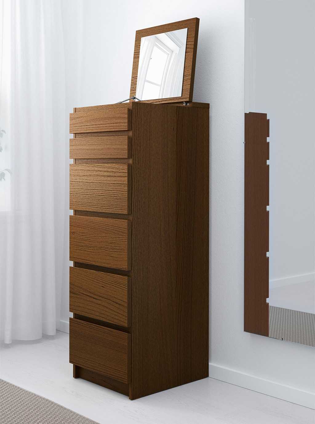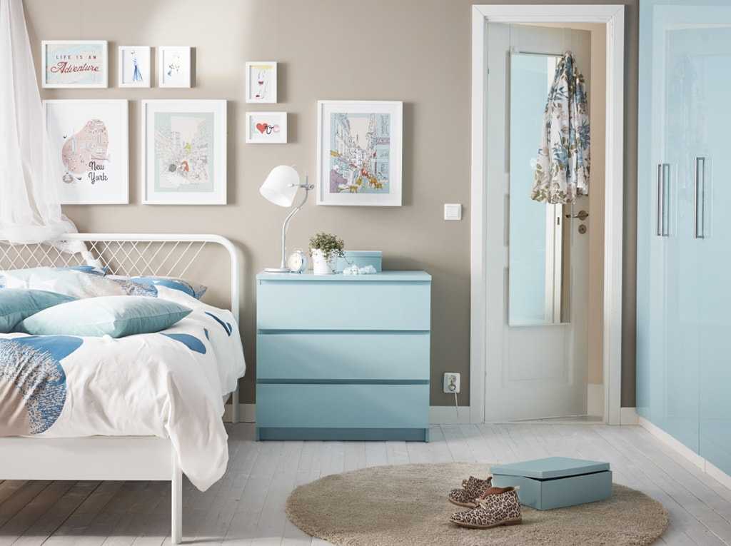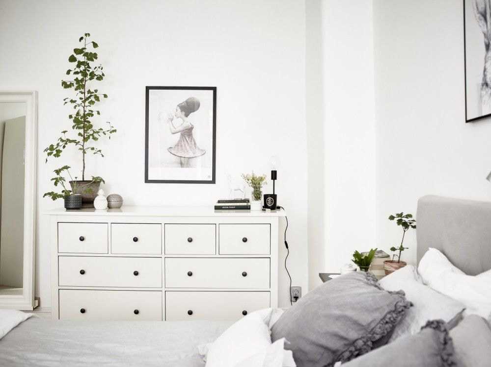 В спальню. Комод в спальне просто необходим, он никогда не устареет и не потеряет спрос. Выбрав модель с 4 или 6 ящиками, Вы с легкостью уместите халаты, пижамы, белье и постельные принадлежности. Ведь очень удобно, утром проснутся и быстренько спрятать одеяло и подушки, придав в спальне порядок и уют. Также можно выбрать комод со стильным зеркалом, он станет прекрасным вариантом туалетного столика, в котором уместится вся косметика, парфюмерия, украшения и много другой разной мелочи. Например, стильный и вместительный Икеа комод Мальм с 6 ящиками (4 больших, верхний разделен на два) или Биркелан с 6 ящиками, белого цвета, прекрасно спрячет постельные принадлежности от чужих взглядов, как показано на фото;