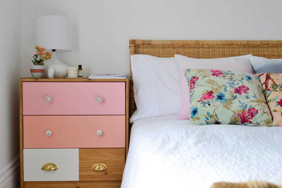 Центральная фигура — комод. Он должен выделяться благодаря контрастному цвету или большому размеру. Такой вариант подойдёт для прямоугольного посещения. Комод располагают в поле зрения человека, входящего в двери спальни. Кровать предпочтительнее односпальная. Бюджетный вариант — складной диван или тахта. Зеркало, размещенное над комодом, также подчеркнёт его визуально. Уют в комнате создаётся за счёт мягкого медведя на кровати или декоративных подушек. В интерьер впишется небольшой навесной подсвечник белого или бежевого цвета. На прикроватный столик можно поставить винтажный будильник или миниатюру в пастельных тонах. Чем меньше декоративных вещей в помещении, тем комфортнее атмосфера спальни.