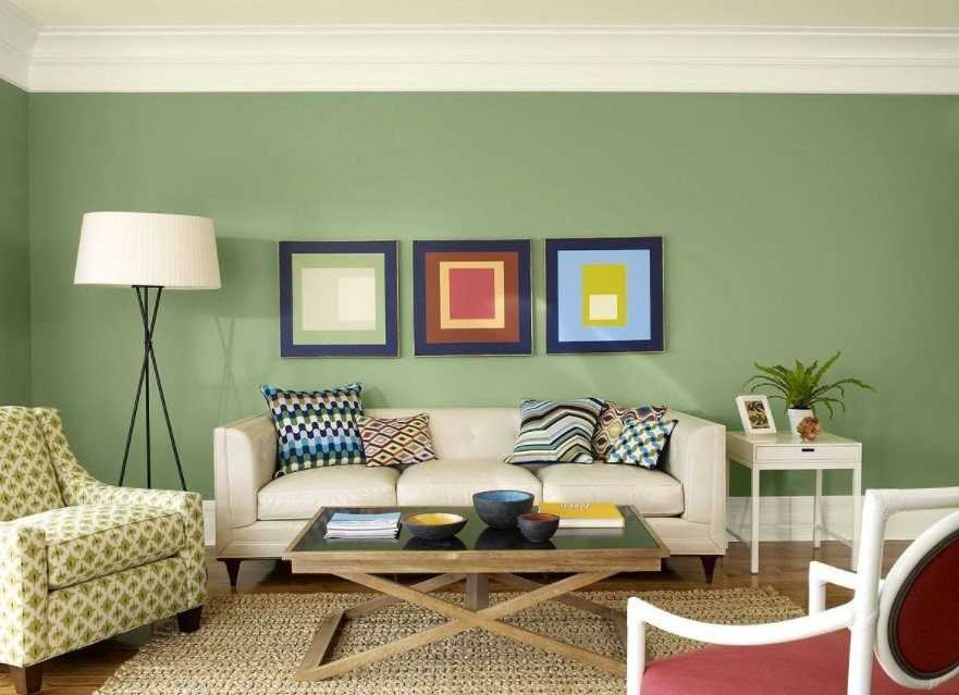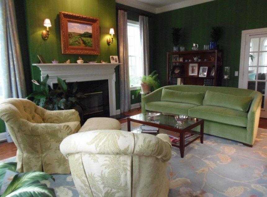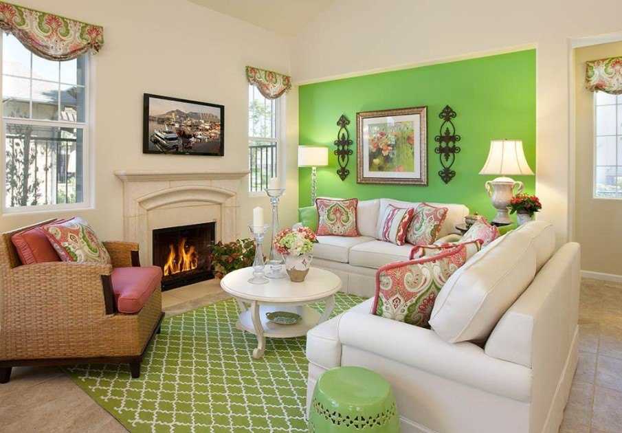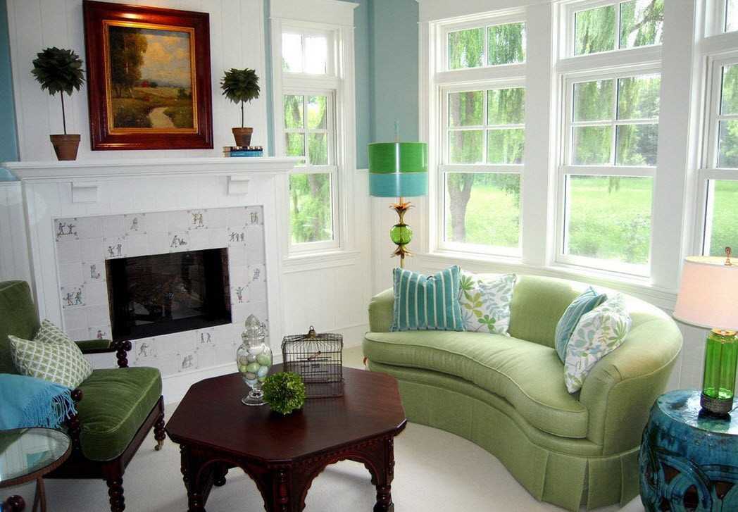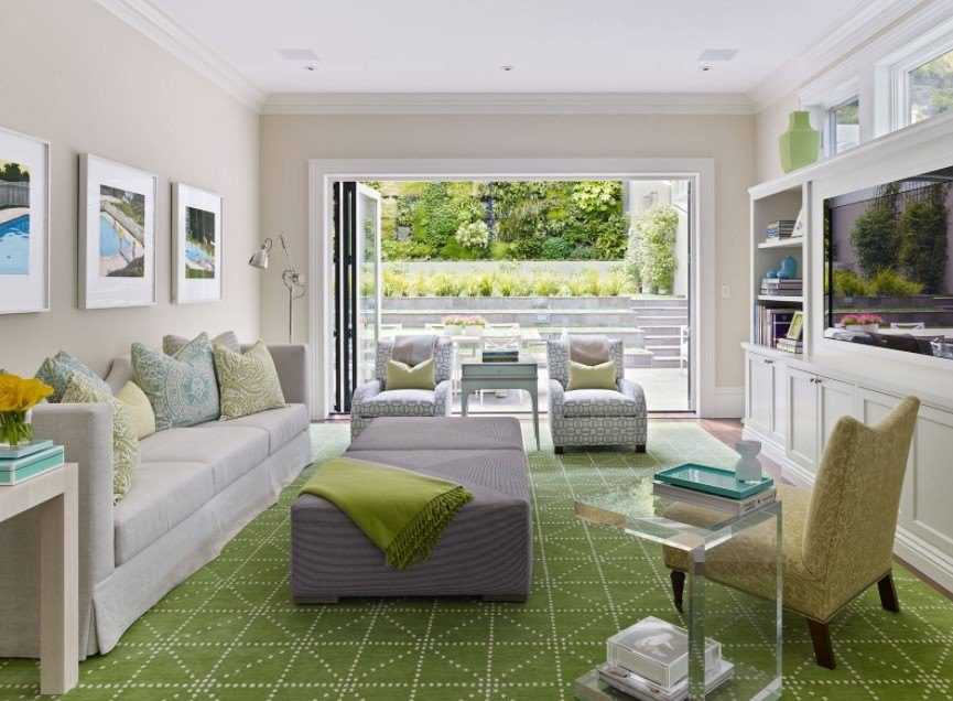 Как мы уже говорили, для создания полной гармонии, основной зелёный цвет в дизайне гостиной следует непременно дополнять и разбавлять другими цветами, и наиболее приемлемыми вариациями в этом случае можно назвать классический белый, серый, жёлтый, синий, бежевый либо коричневый. При этом сопутствующие оттенки могут быть использованы во всех своих проявлениях.