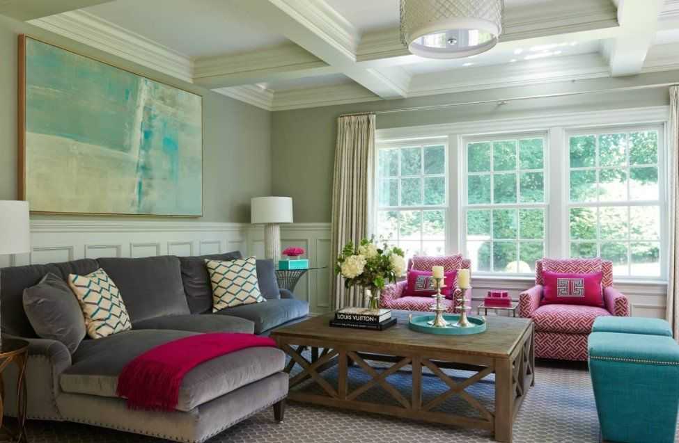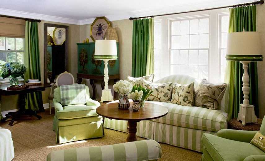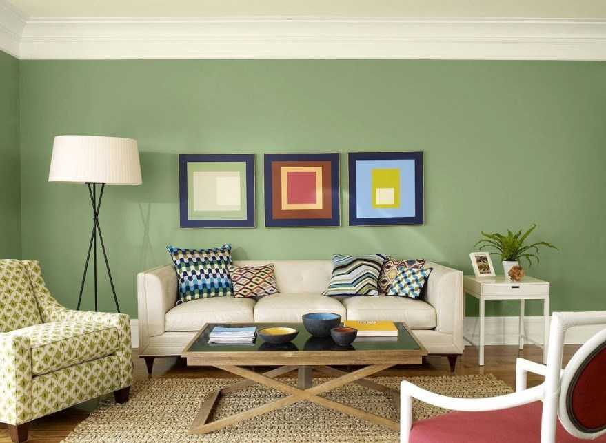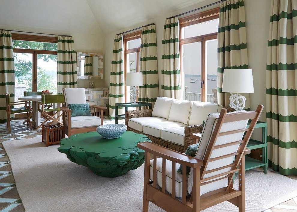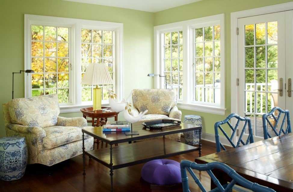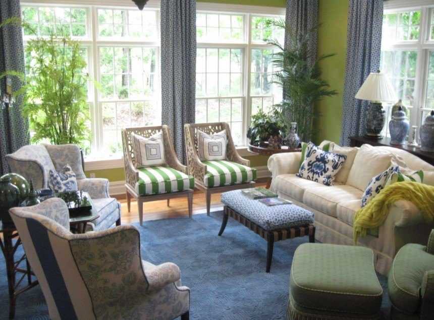 Как мы уже говорили, для создания полной гармонии, основной зелёный цвет в дизайне гостиной следует непременно дополнять и разбавлять другими цветами, и наиболее приемлемыми вариациями в этом случае можно назвать классический белый, серый, жёлтый, синий, бежевый либо коричневый. При этом сопутствующие оттенки могут быть использованы во всех своих проявлениях.