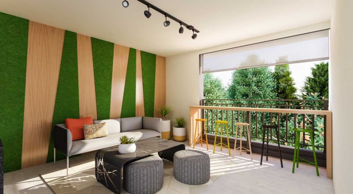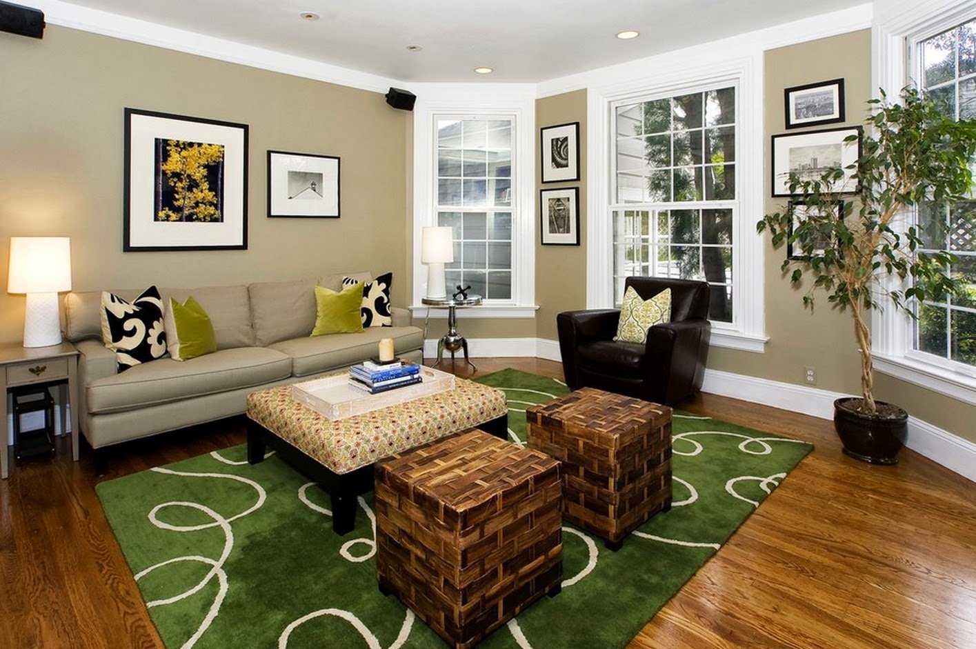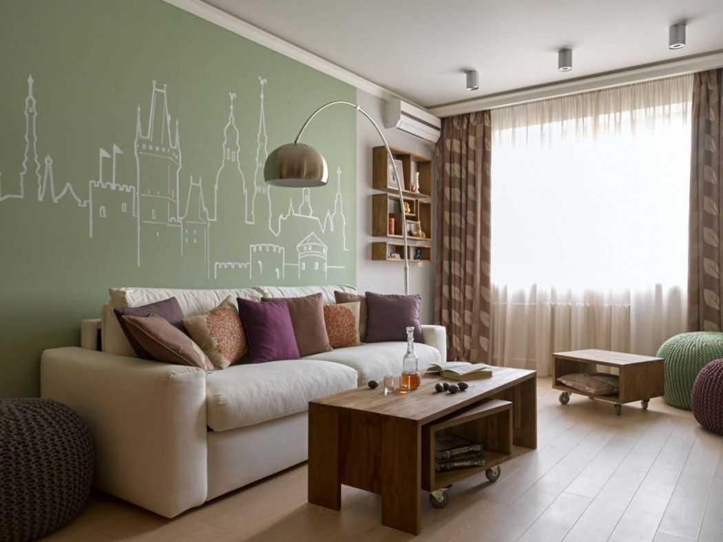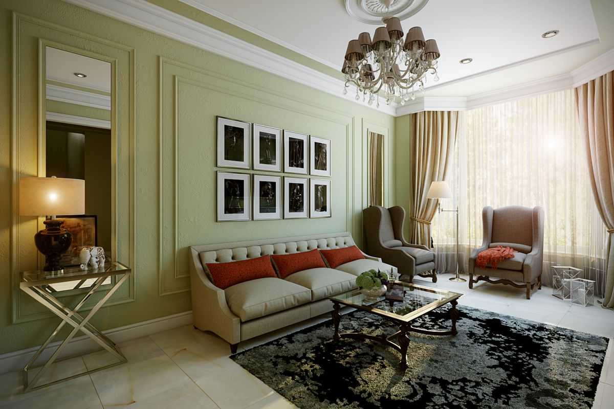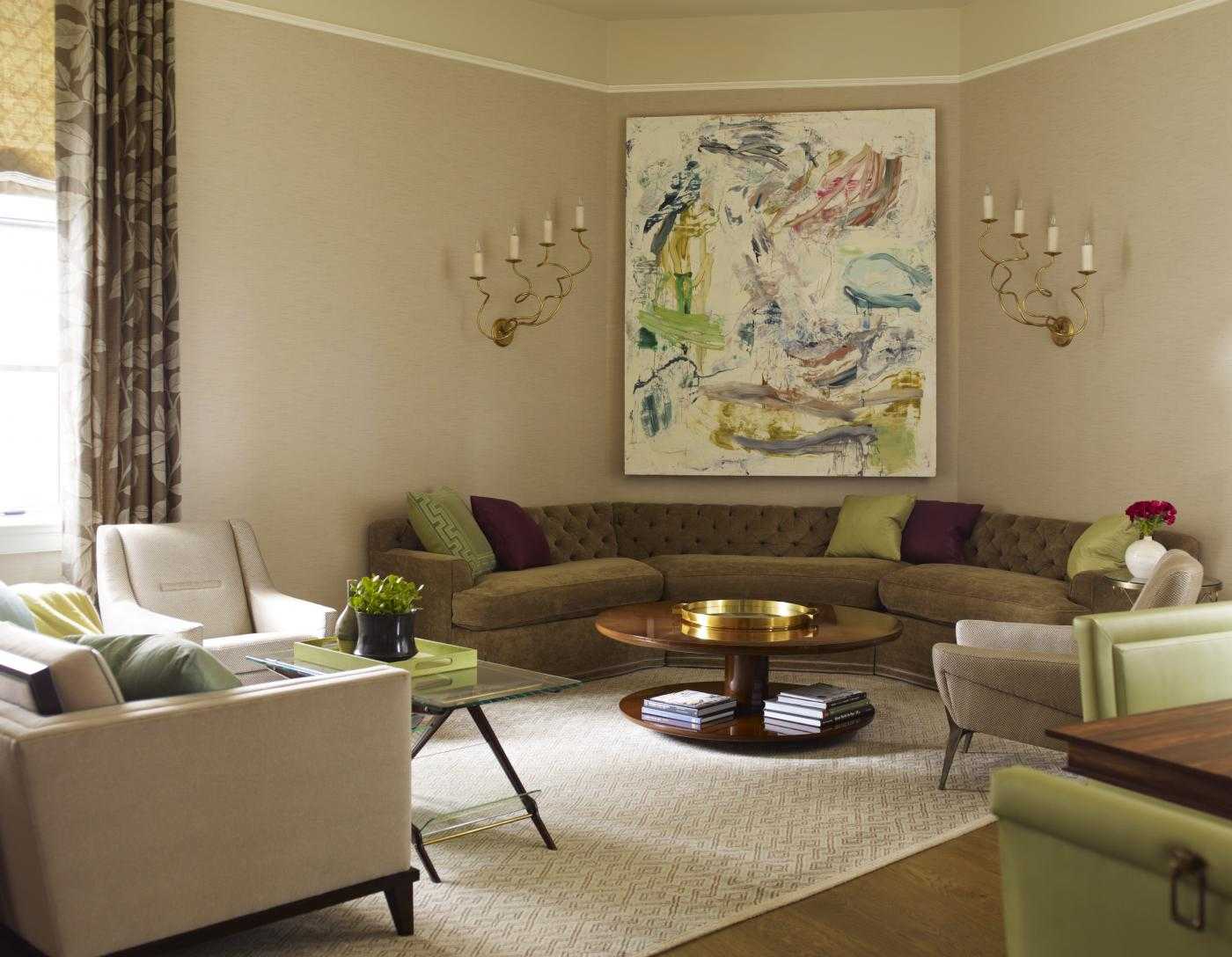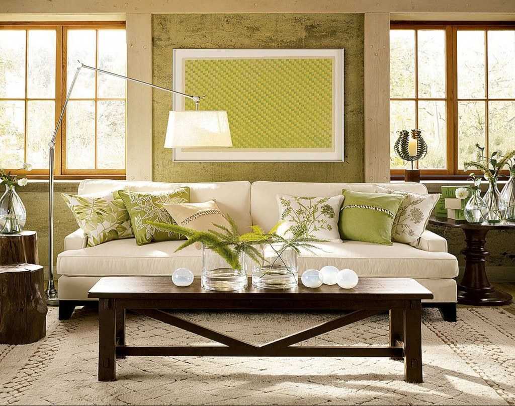 Оформление интерьера в бежево-зелёных тонах можно заслуженно назвать пределом умиротворения. Бежевый смотрится не так категорично, как белый, и дополняет зелёную гамму нотками тепла. Поэтому общая энергетика такой гостиной будет одновременно смотреться достаточно спокойно, но без эффекта «засыпания».