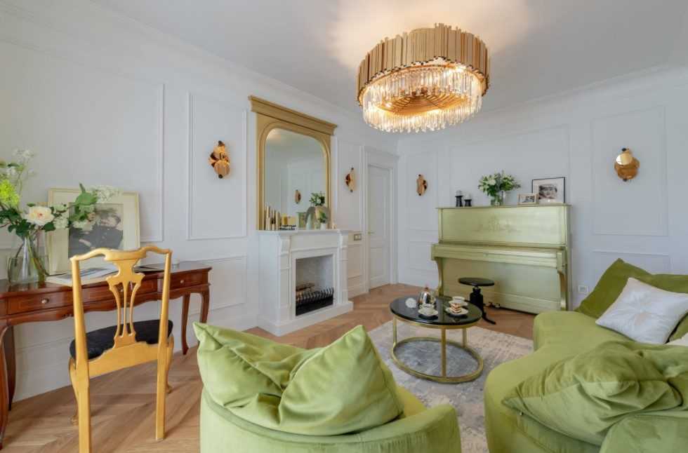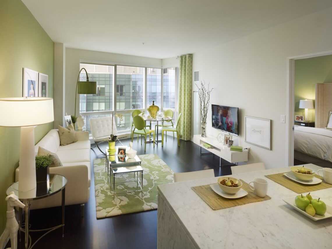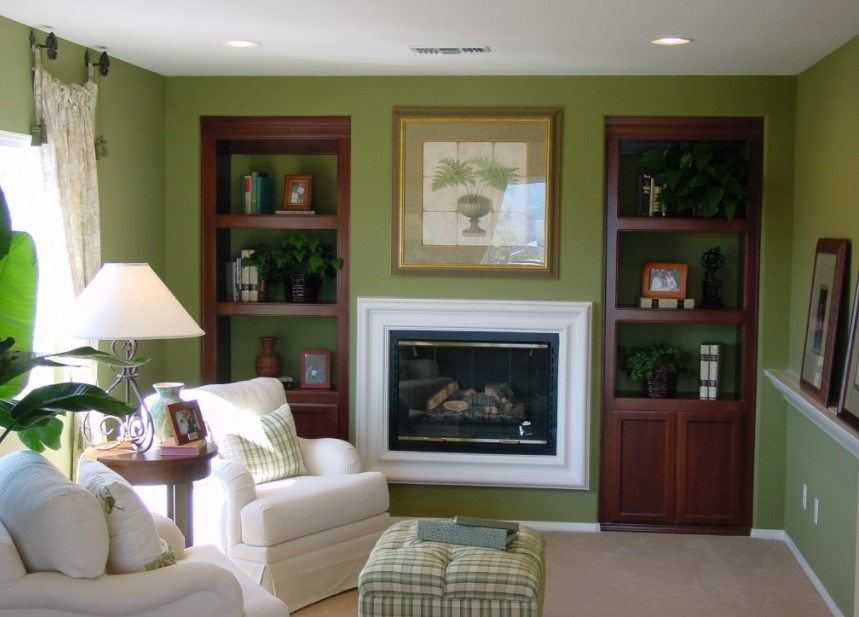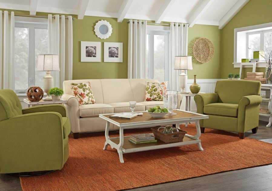 Сочетание белого и оливкового в интерьере гостиной позволит создать одновременно сдержанное, располагающее и тёплое оформление, приемлемое для реализации практически в любом стилевом направлении.
