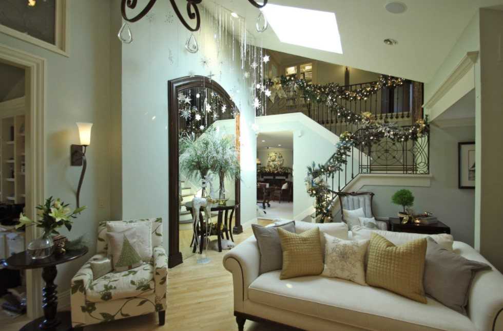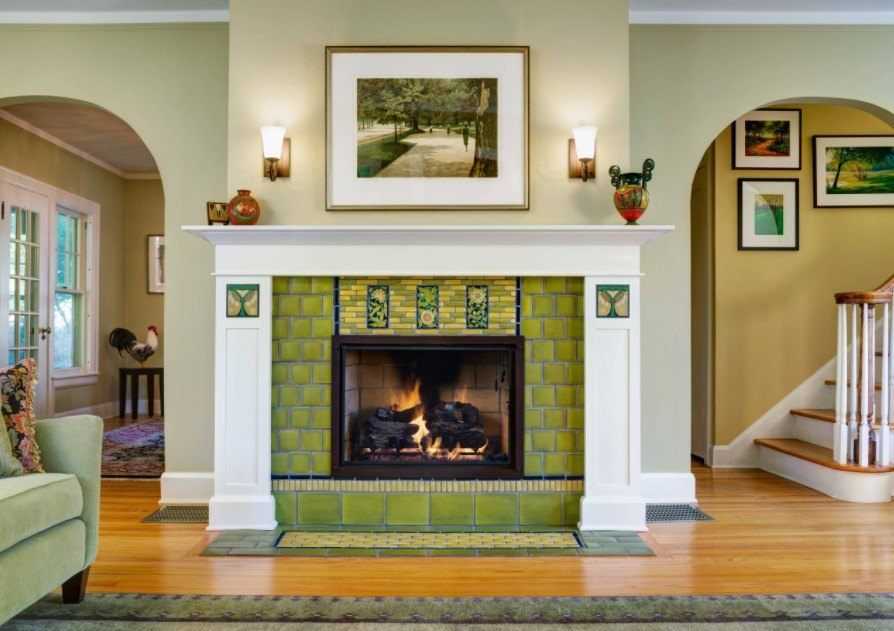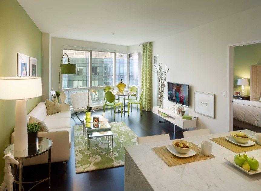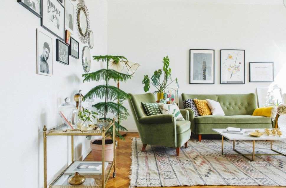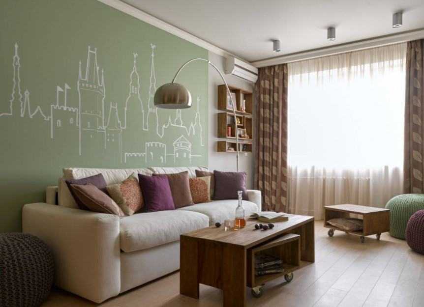 Тандем зелёного и белого идеально впишется в современные примеры интерьера с наличием металлических или блестящих поверхностей либо станет прекрасной идеей для оформления комнаты в ретро-винтажном стиле. Основное правило – играем на полутонах, и тогда гостиная наполнится воздухом и будет «дышать».