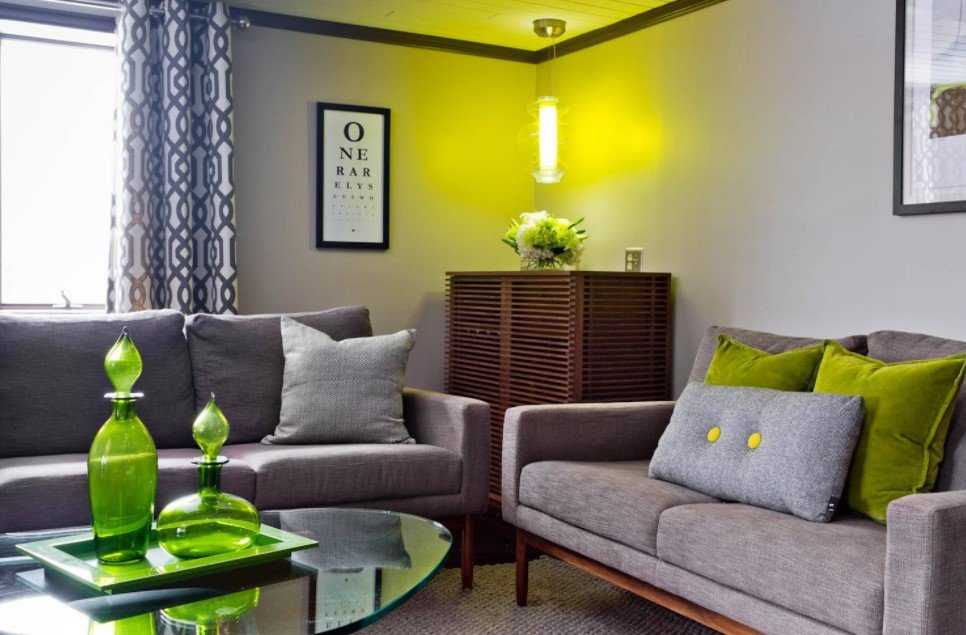 В комбинации зелёного и серого в большинстве предложений зелёный сочетается со светлыми серыми оттенками, которые уравновешивают яркость основного цвета, в результате чего серо-зелёный тандем смотрится оригинально, благородно и сдержанно.