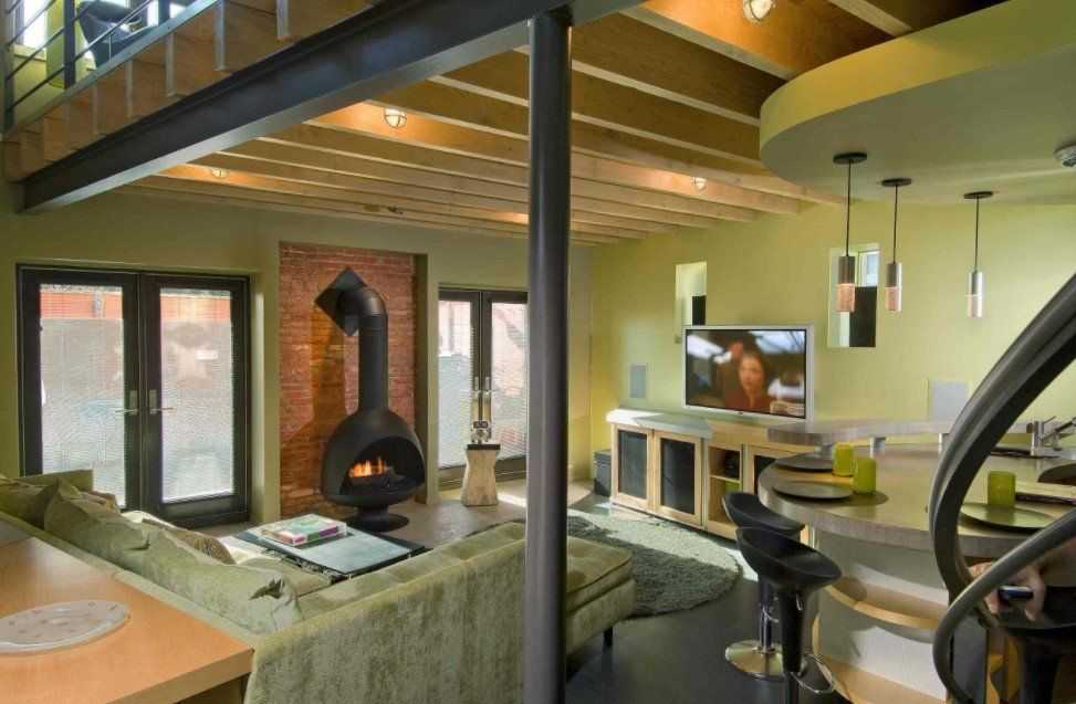 Здесь не столь интересны коричневые предметы мебели, как сама идея использования пространства в квартире. Смотрите: это кухня, совмещенная с гостиной и ОФИСОМ. Это ведь беленькое рабочее место справа с компьютером и стульями. Весьма необычно, но не очень практично: вкусные запахи от готовки еды будут мешать умственной активности мозга во время работы.