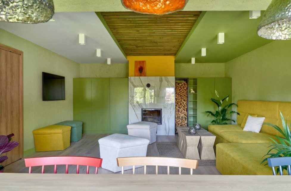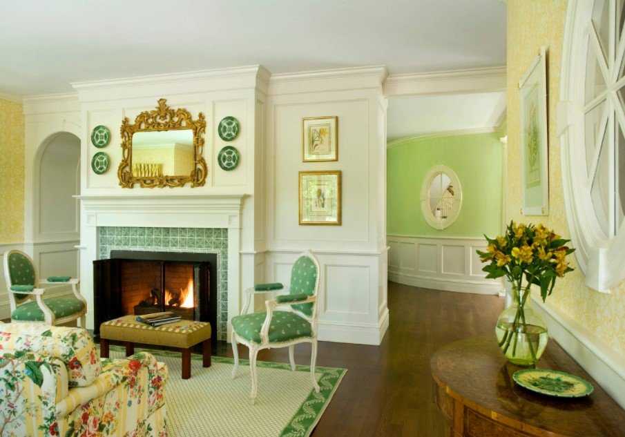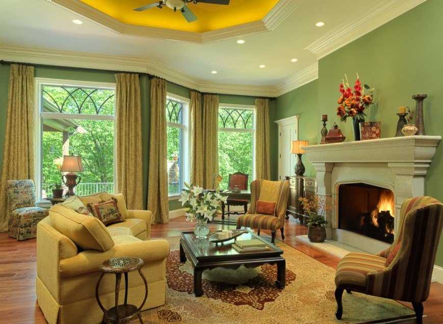 Гостиная, совмещающая в себе желтые и оливковые оттенки – это неудержимая энергия, бодрость и жизнерадостность. Сочетание таких цветов автоматически вызывает подъём настроения, усиливает аппетит и призывает к активным действиям. Поэтому, собирая гостей в такой гостиной, следует обязательно позаботиться о весёлых развлечениях или танцевальных «пятиминутках».