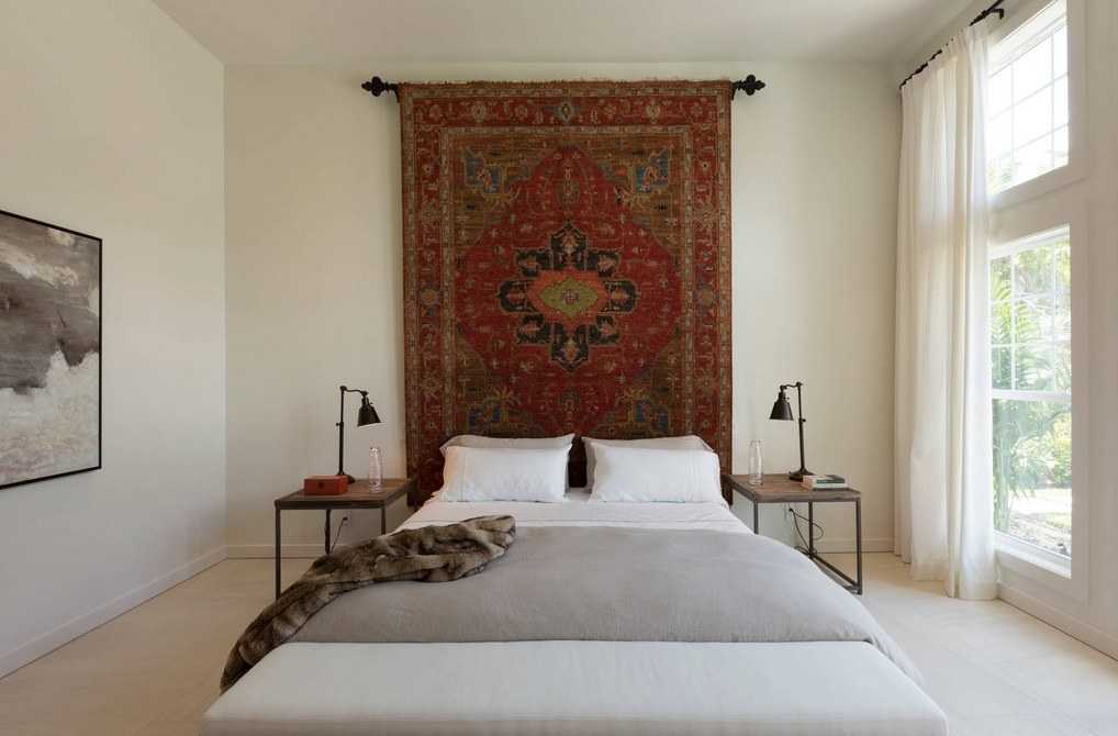 - Марокканский ковер, подобный этому с фотографий Elle Decor, хоть и занимает значительное место над кроватью, но остается нейтральным фоном для этой безмятежной спальни. Он придает стене дополнительную теплоту и глубину.