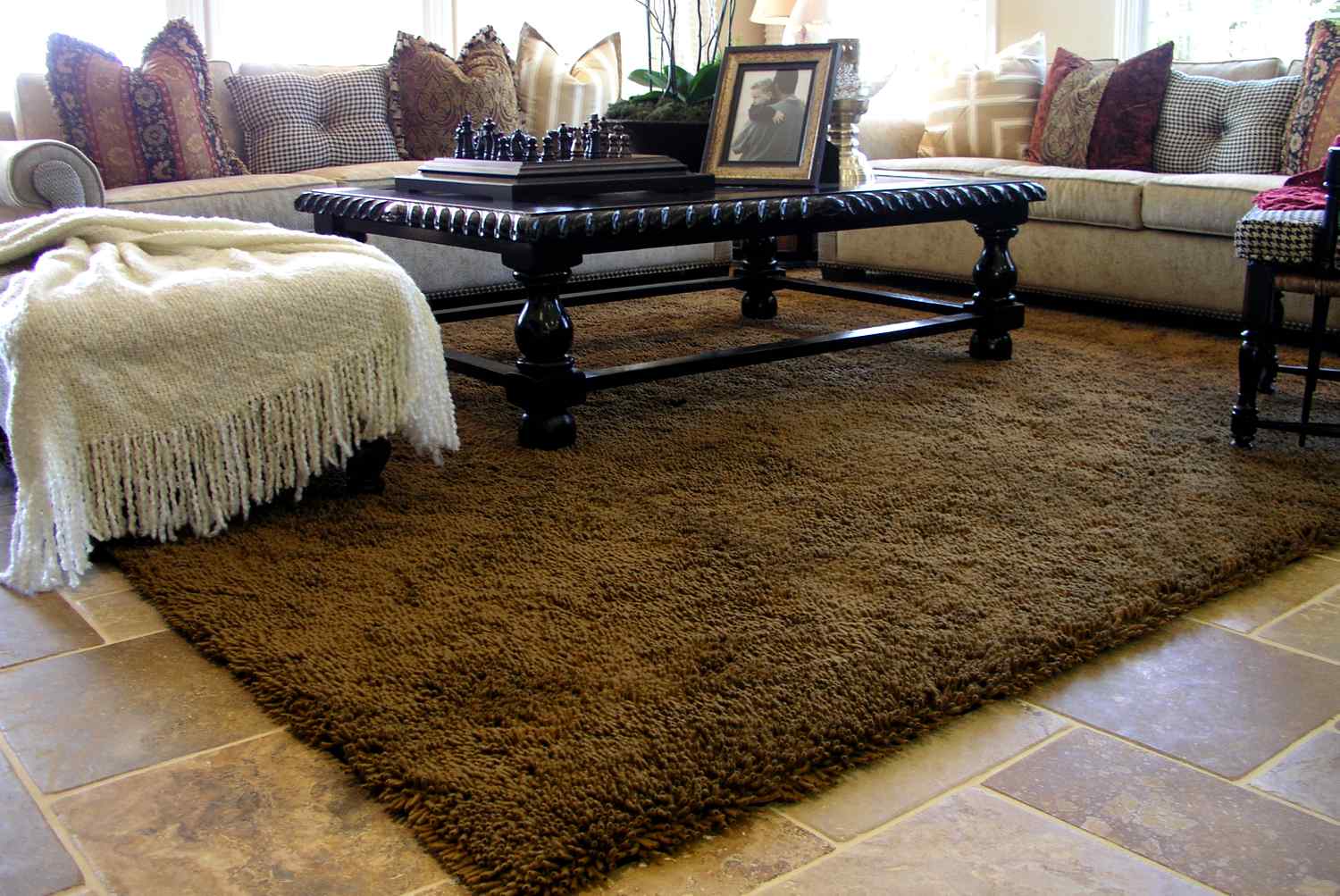 Домашний уют создадут тафтинговые или тканые ковры с высоким ворсом. Смело используйте дизайнерские приемы, вроде ярких цветных или набивных рисунков.