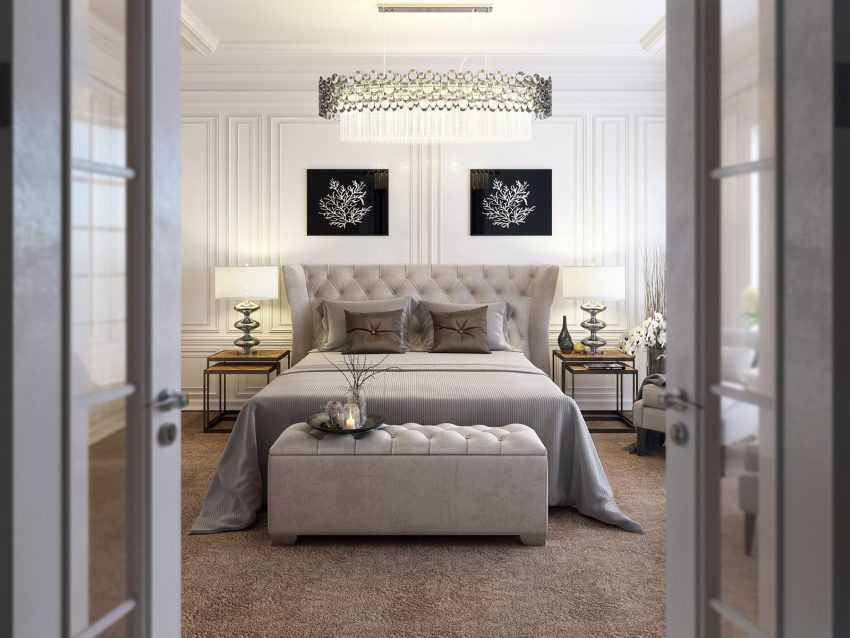 Фото: черно-белые потолки с люстрой в спальне