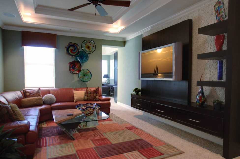 Что касается мебели, то она должна быть удобной и функциональной, лишние предметы лучше убрать. Разделяя небольшую гостиную на зоны можно использовать ширмы и перегородки, стеклянные или зеркальные элементы. Визуально увеличить пространство позволяет зеркала и глянцевые поверхности, натяжной потолок.