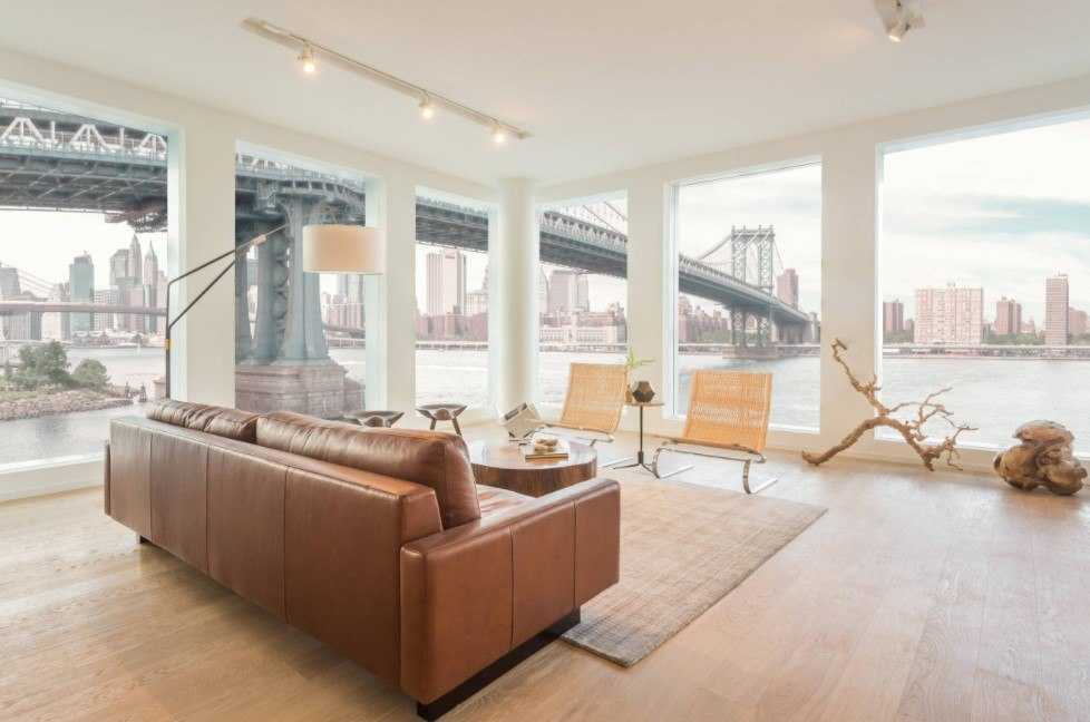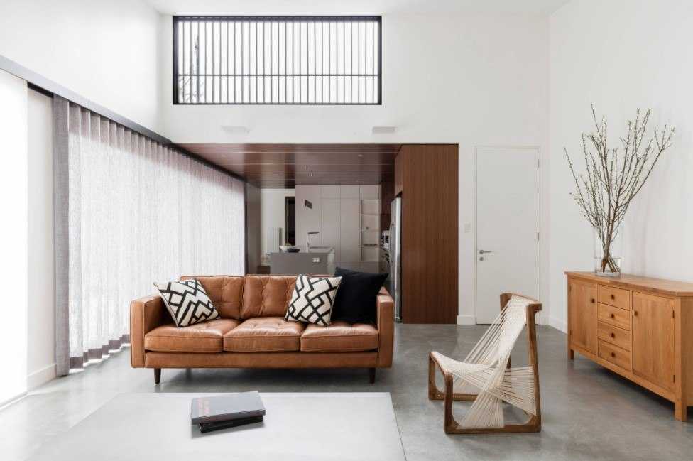 Минимализм. Натуральный кожаный светло-шоколадный диван станет отличным акцентом в интерьерном пространстве. С помощью красочных подушек, рамок для фото и подобных аксессуаров можно разнообразить комнату.