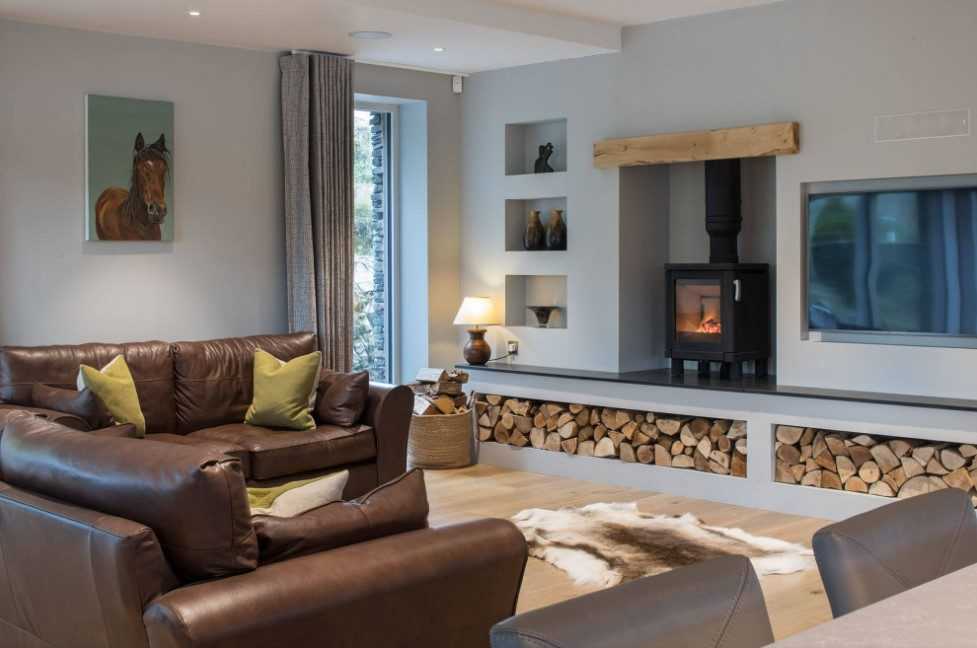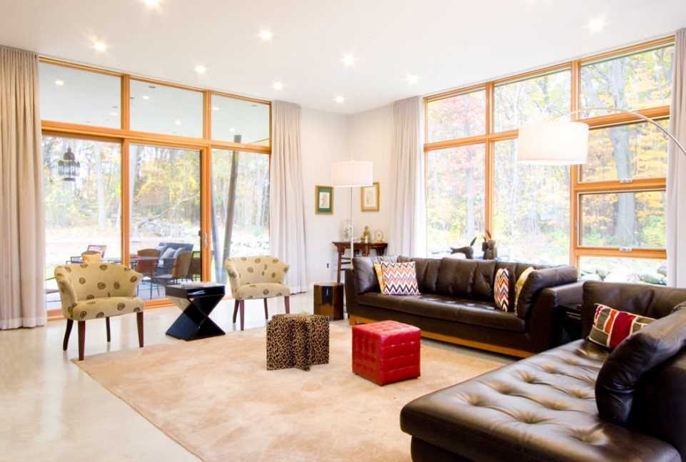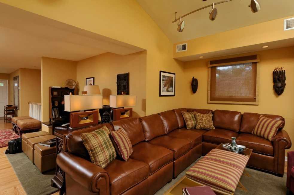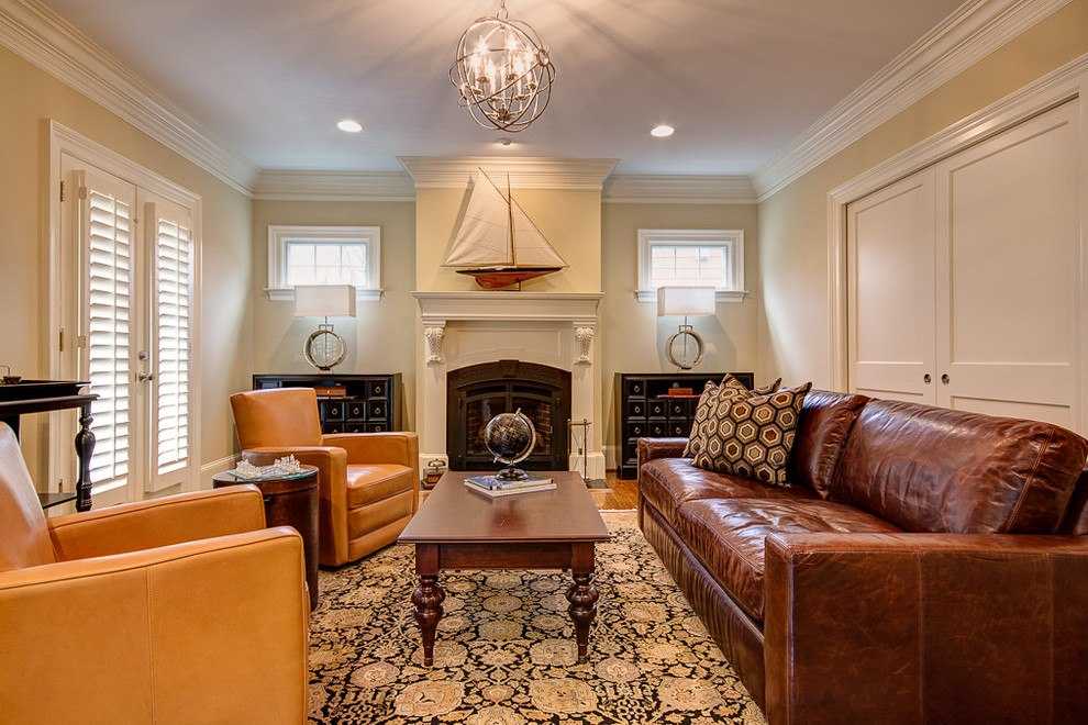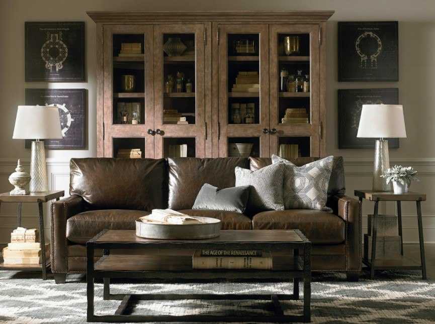Для тех кто предпочитает прямые кожаные диваны в интерьере, стоит опасаться что они могут занять много места. Как правило, их ставят вдоль стены, но в некоторых вариантах и посреди комнаты. К примеру возле стола или напротив камина.
